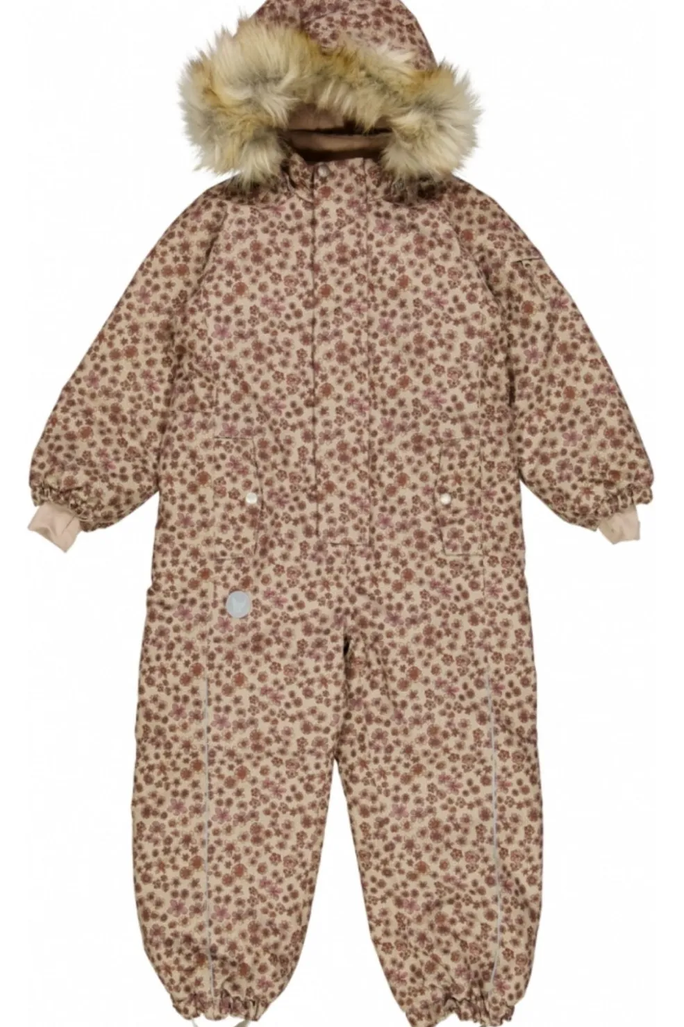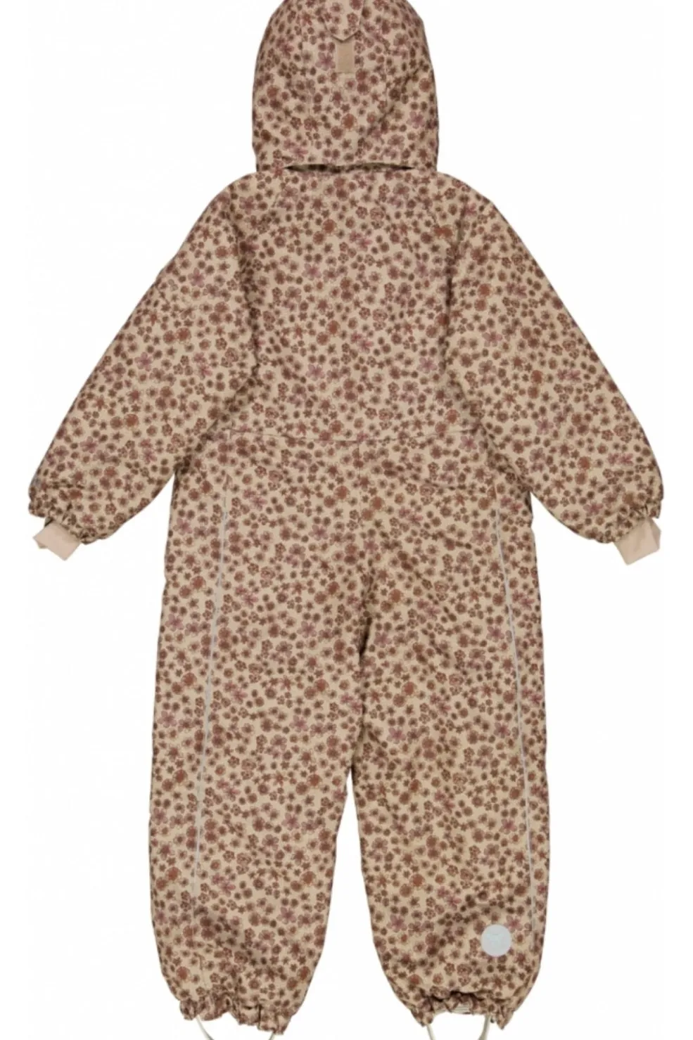 Lækker flyverdragt i blomster print, fra Wheat, med blød indvendig fleece foring, aftagelig hætte med ribkant rundt i åbningen. Flyverdragten har skrå side lommer med trykknap, , elastik ved håndled med vindstopper funktion, samt elastikkant ved ankler og har justerbar gummi fodstropper.