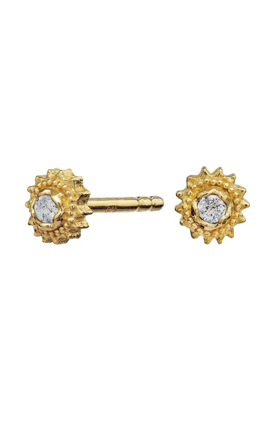 Små øreringe fra Maanesten med et solformet design og en central sten. De små øreringe har en diameter på 4 mm og er fremstillet af genanvendt sterlingsølv med guldbelægning.