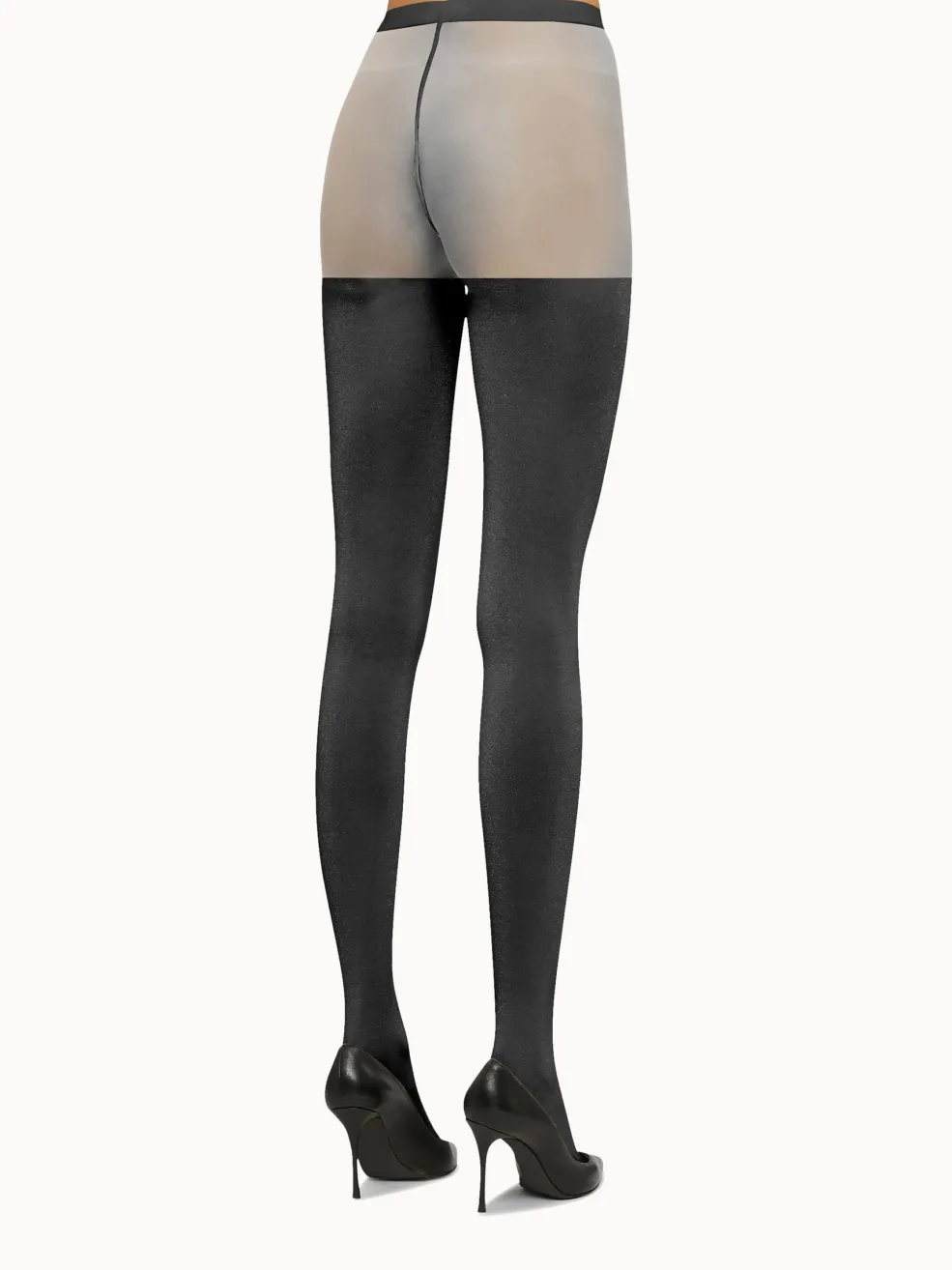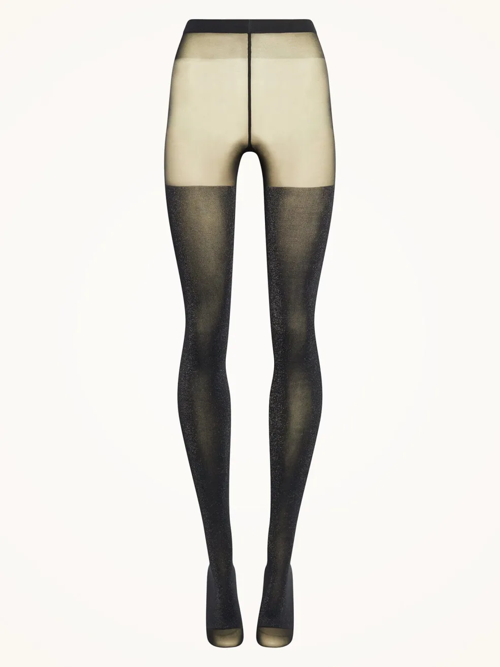 Strømpebukser fra Wolford i sort og grå med skinnende detaljer. Designet har gennemsigtig tådel, lår og topdel, mens benene er uigennemsigtige.