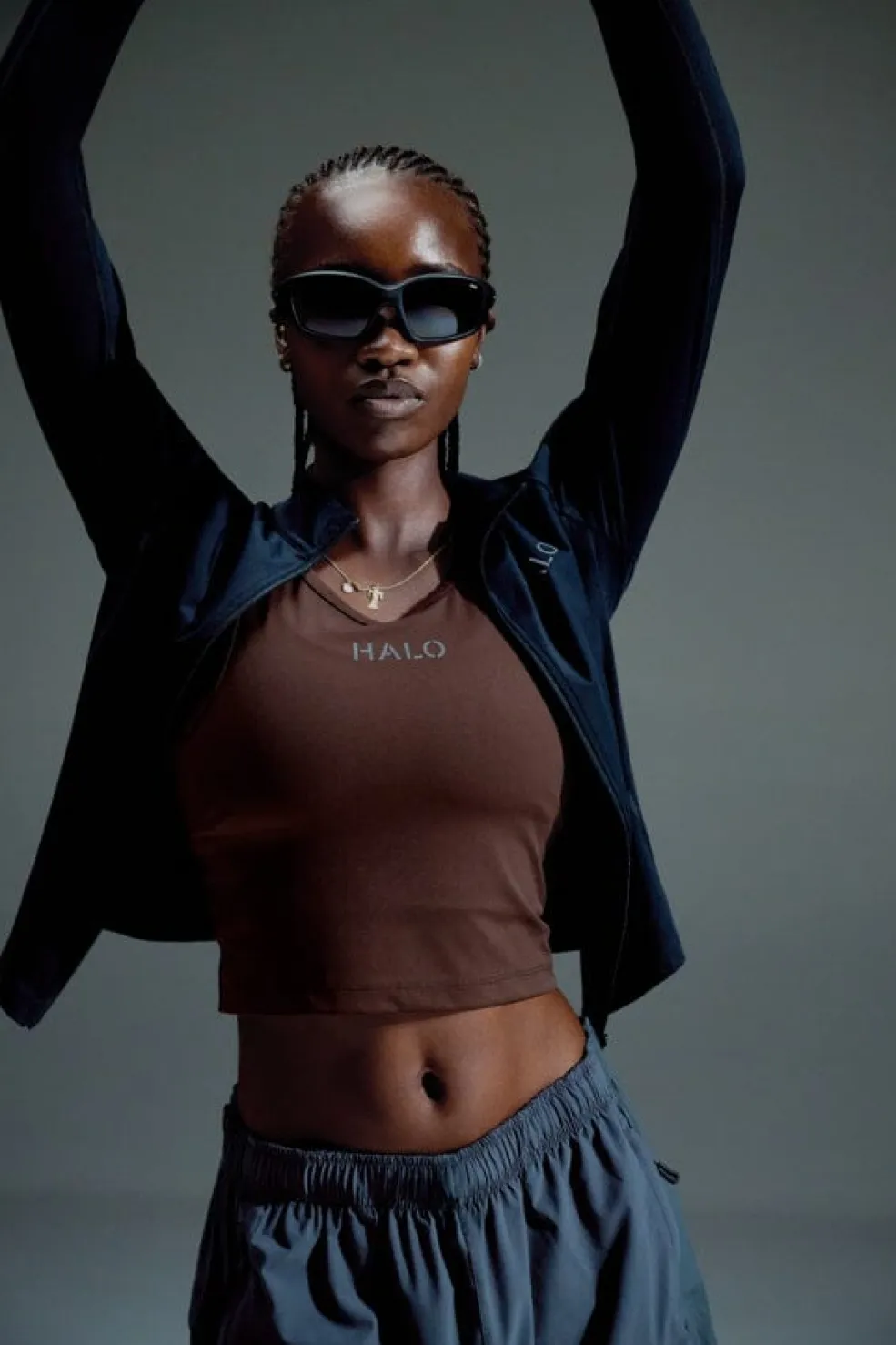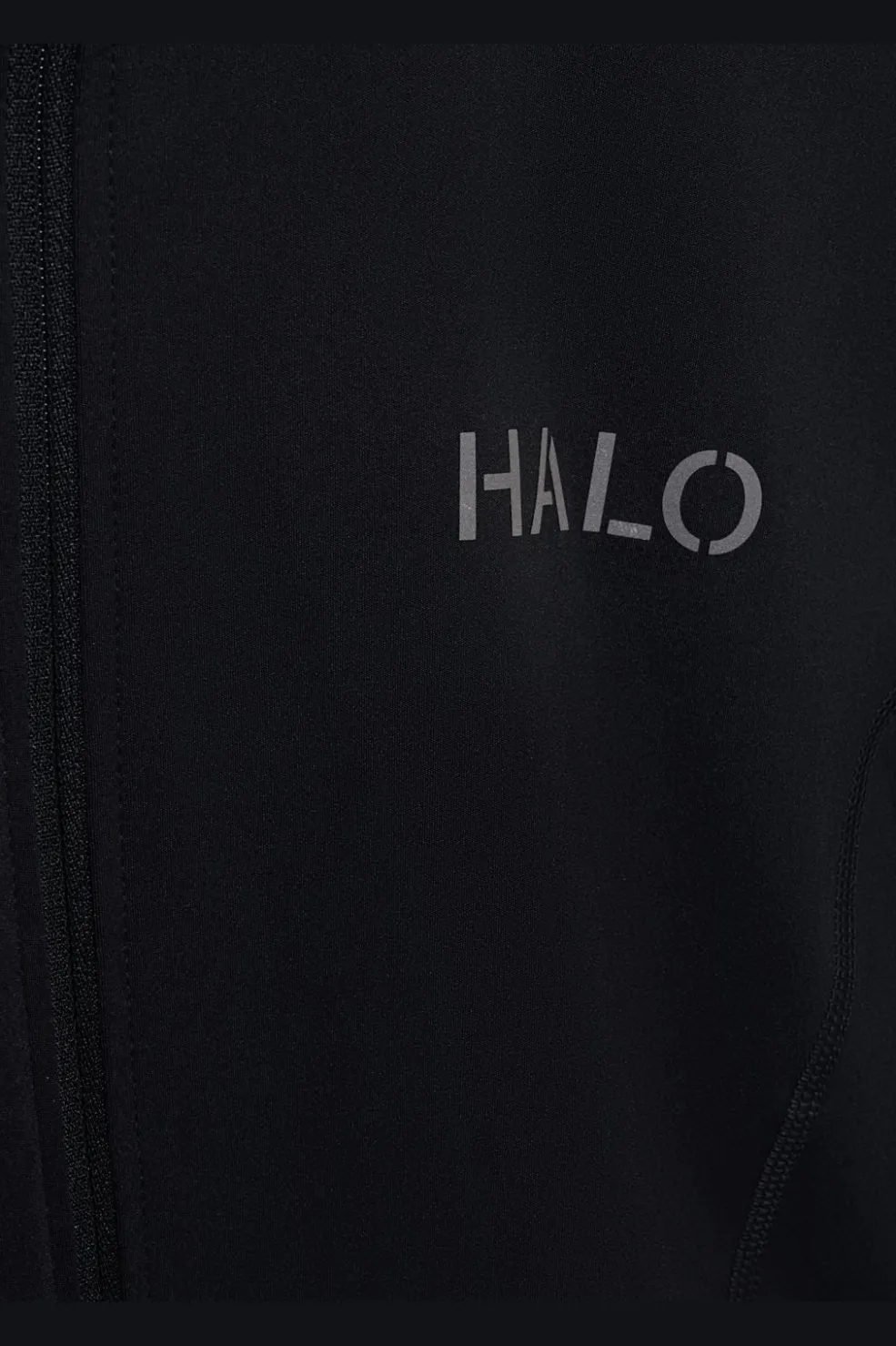 Sort trøje med lynlås fra HALO, fremstillet i fleksibelt polyamid med elastan. Trøjen har refleksprint med HALO-logoet foran og ATW-logoet bagpå.