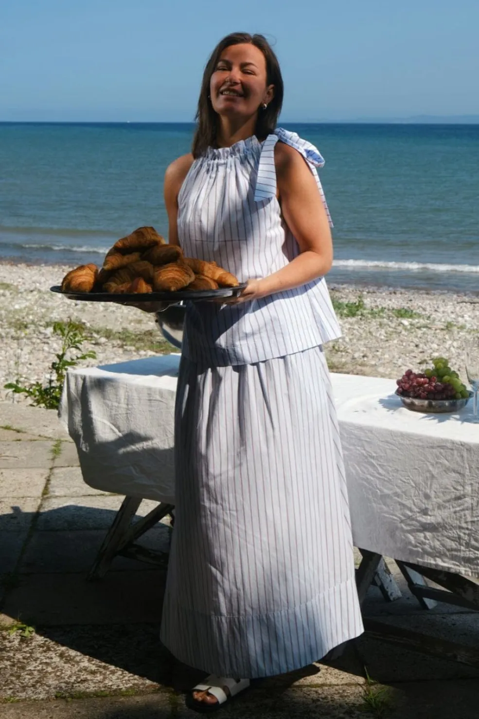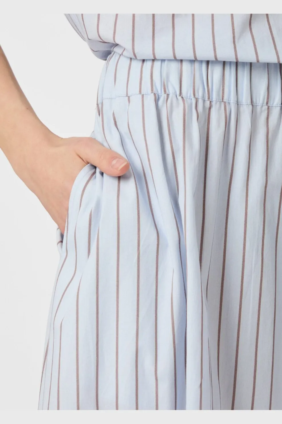 Lang nederdel fra Neo Noir i lyseblå med lodrette striber. Bomuldsstoffet har en sprød kvalitet, og nederdelen har elastik i taljen samt praktiske lommer i siderne.