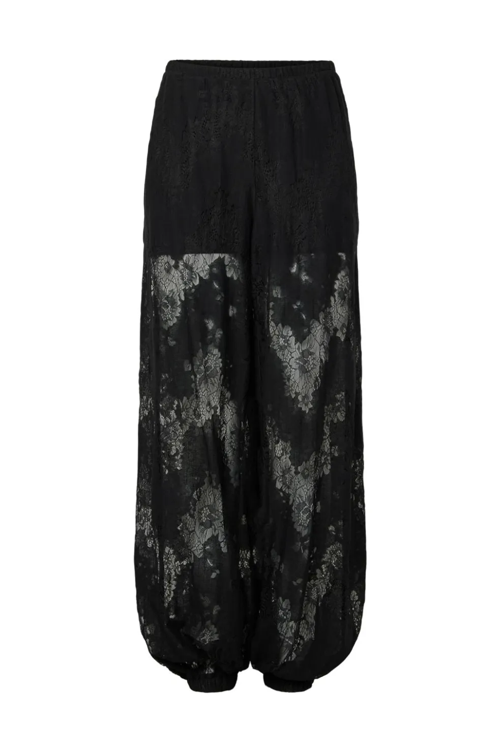 Sorte ballonbukser fra YAS med blomsterblondemønster over hele bukserne. Bukserne er egnede til festlige lejligheder med deres løse pasform og ankel-længde.