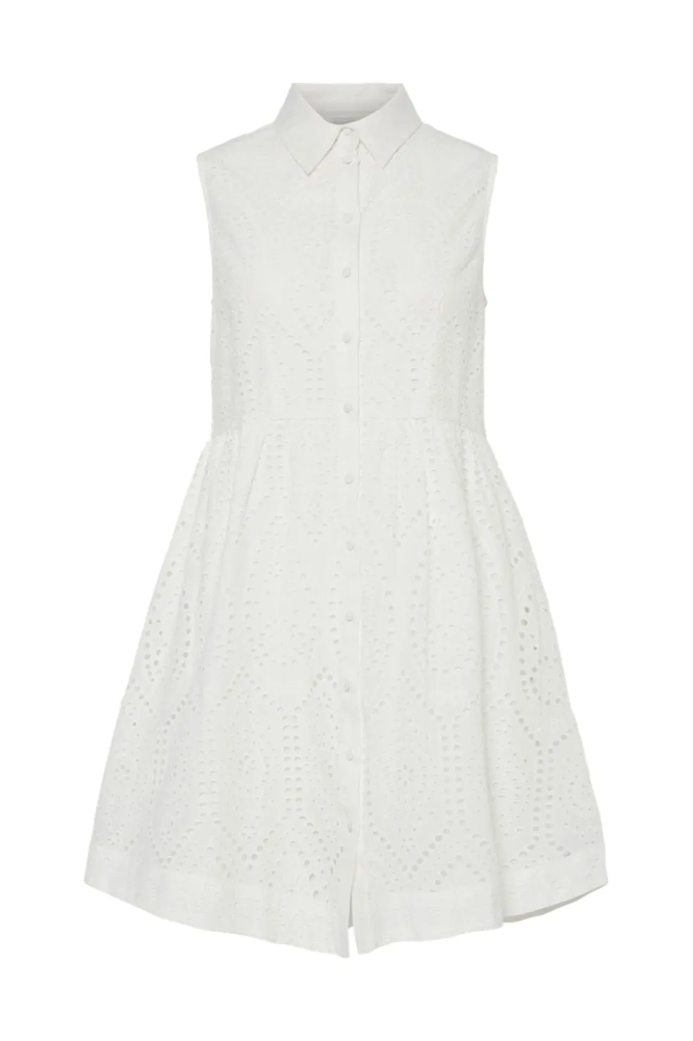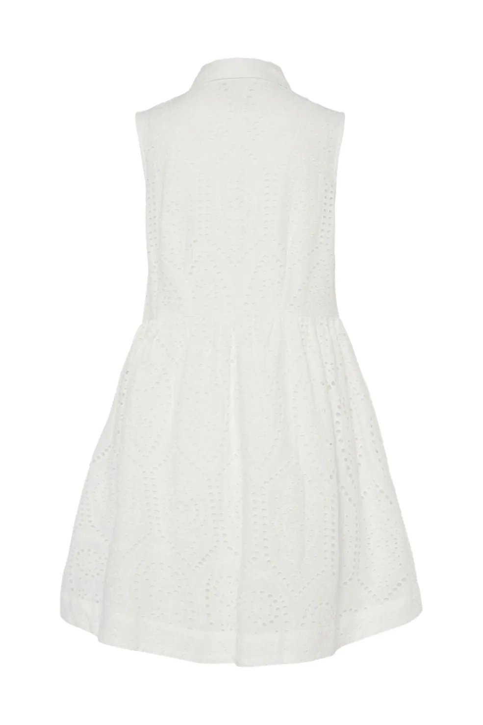 Hvid skjortekjole fra Y. A.S med broderi og udskæringer i stoffet. Kjolen har knaplukning foran, krave og en flared nederdel med taljeskæring.
