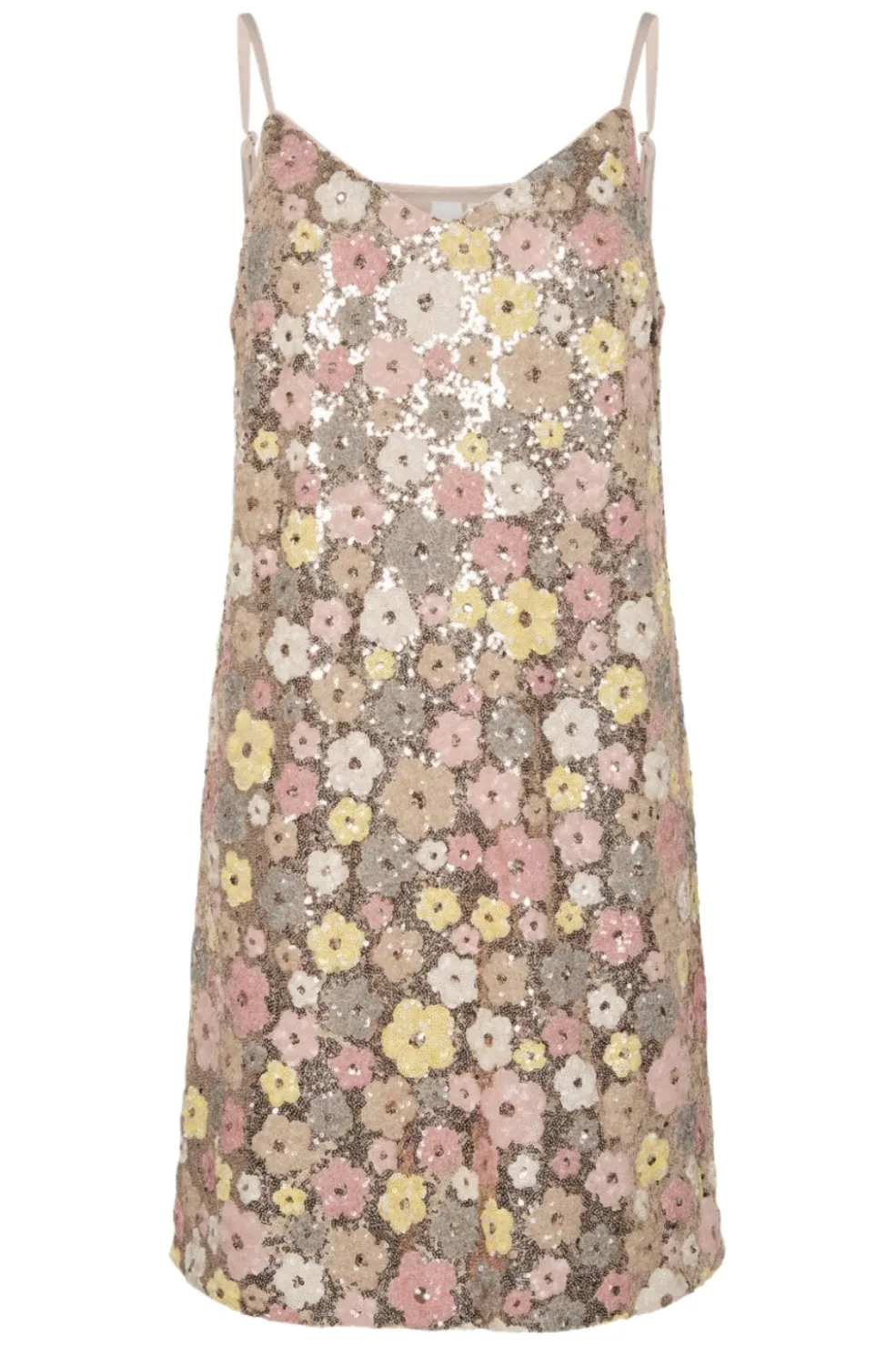 Festkjole fra Y. A.S med palietter i lyse beige, pink og gule nuancer. Kjolen har et blomstermønster og tynde spaghettistropper. Den er lavet af genanvendt polyester med et skinnende udtryk.