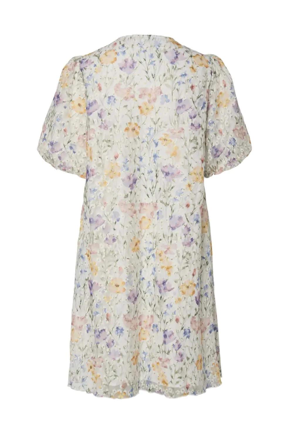 Hvid kjole fra Y. A.S med blomsterprint i pastelfarver. Kjolen har korte pufærmer, V-udskæring og en løs pasform, der går til låret. Broderi og blonder giver kjolen fine detaljer.
