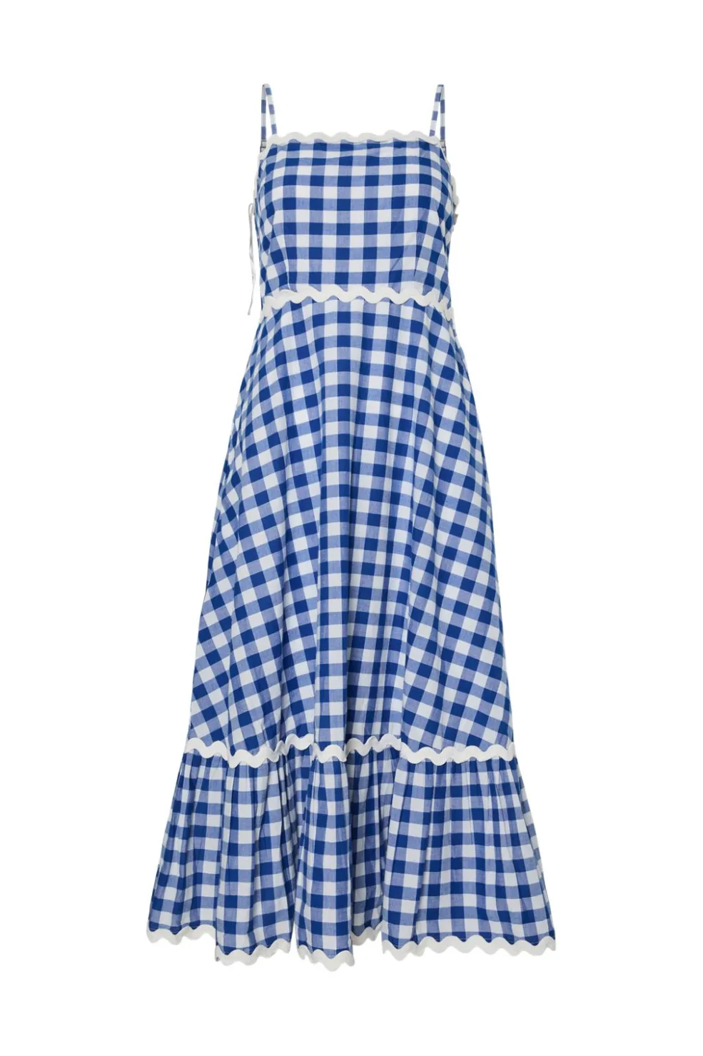 Ternet kjole fra Y. A.S i blå og hvide tern. Kjolen har justerbare stropper og flæsekanter langs kanten. Den går til midt på læggen og har bindebånd i taljen.