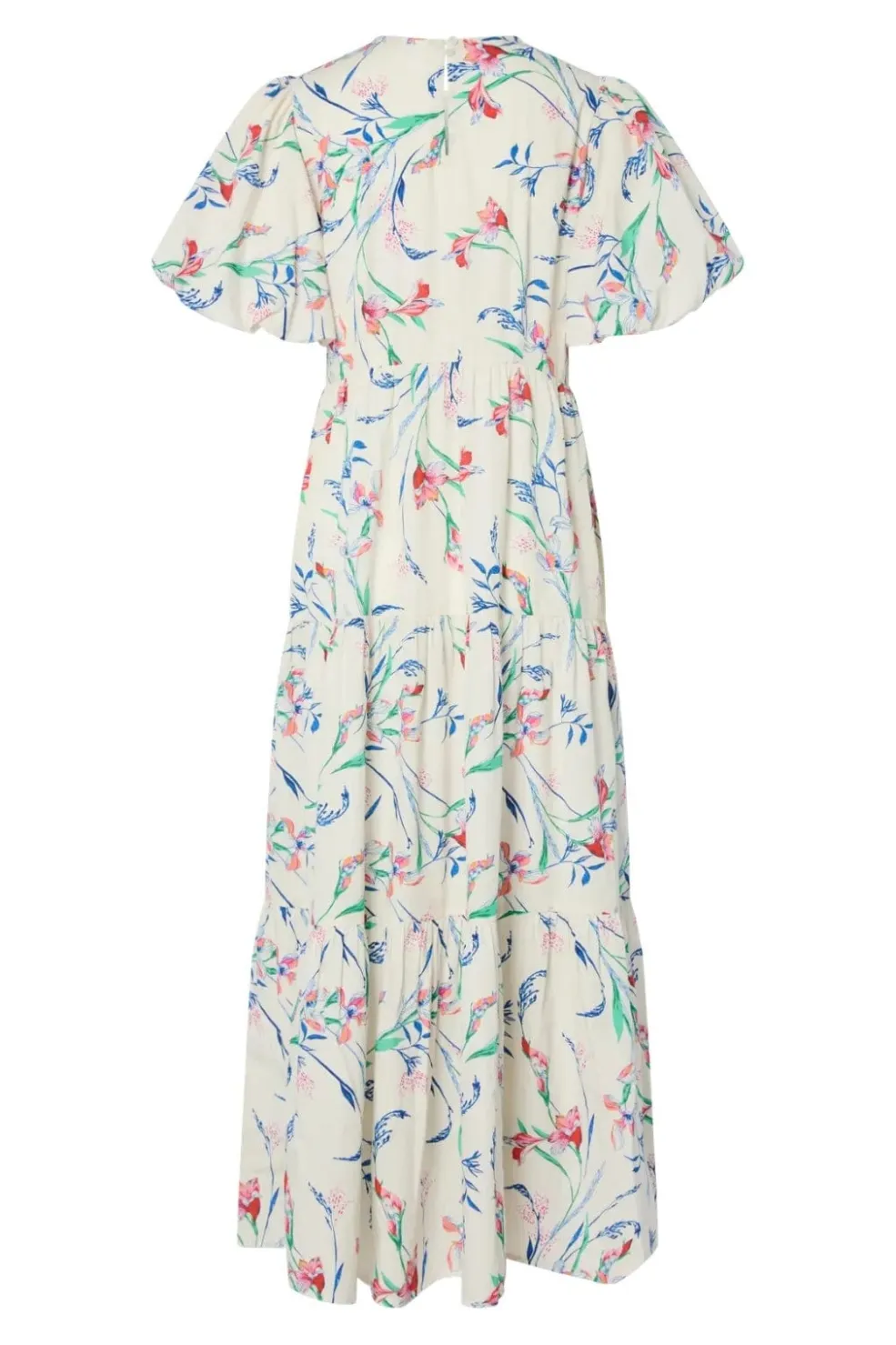 Ankellang kjole fra Y. A.S med blomsterprint i lyse farver. Kjolen har pufærmer og et lagdelt design med flæser. Den runde halsudskæring og de korte ærmer giver en enkel stil.