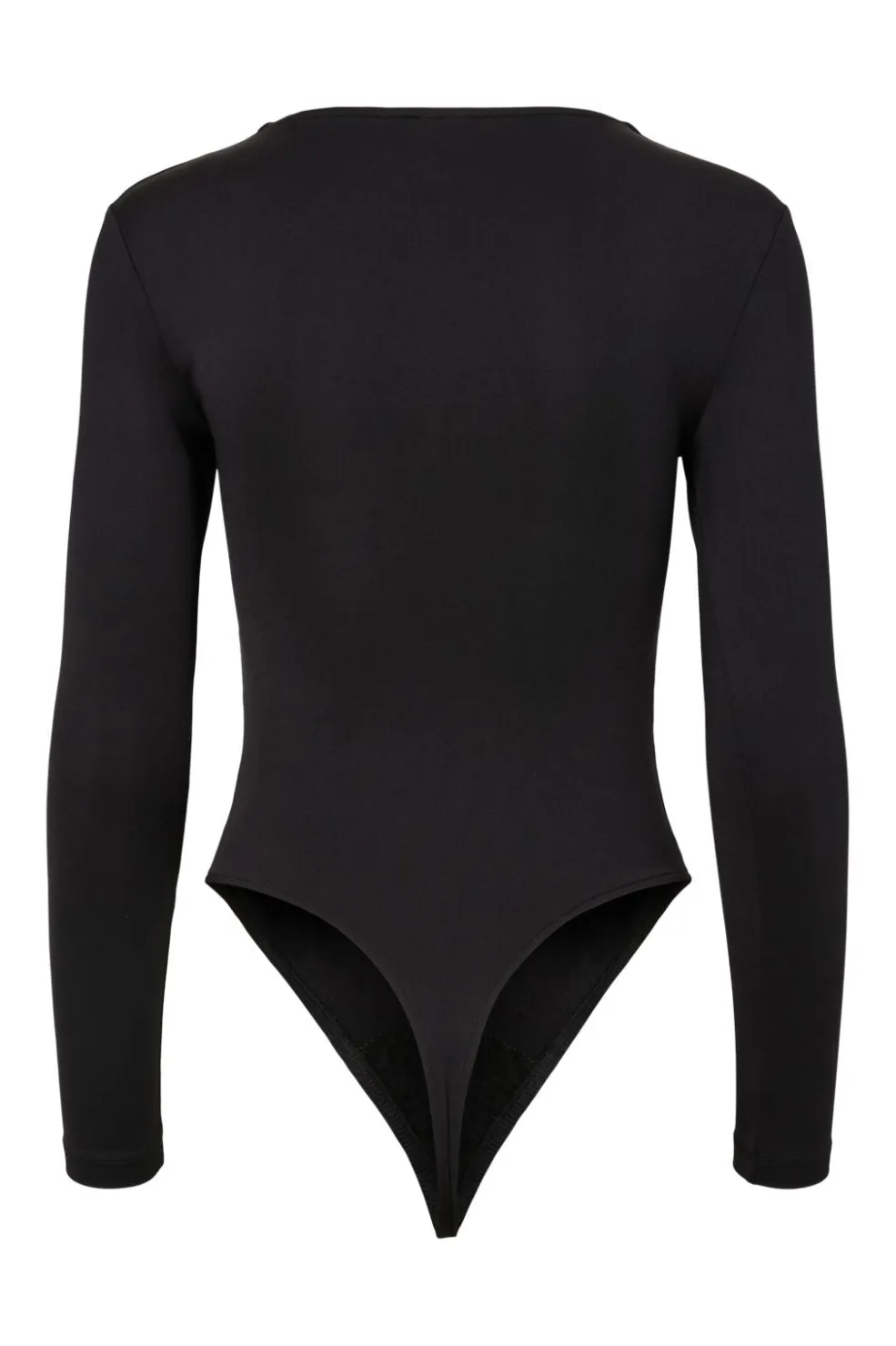 Sort body fra Y. A.S med høj halsudskæring og lange ærmer. Bodyen er lavet af genanvendt polyamid med stræk, der giver en tætsiddende pasform.