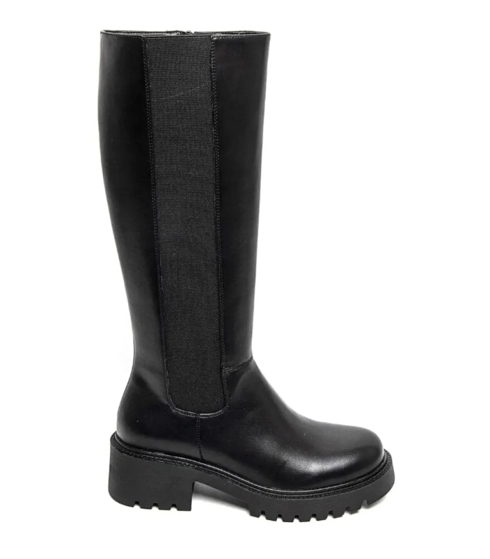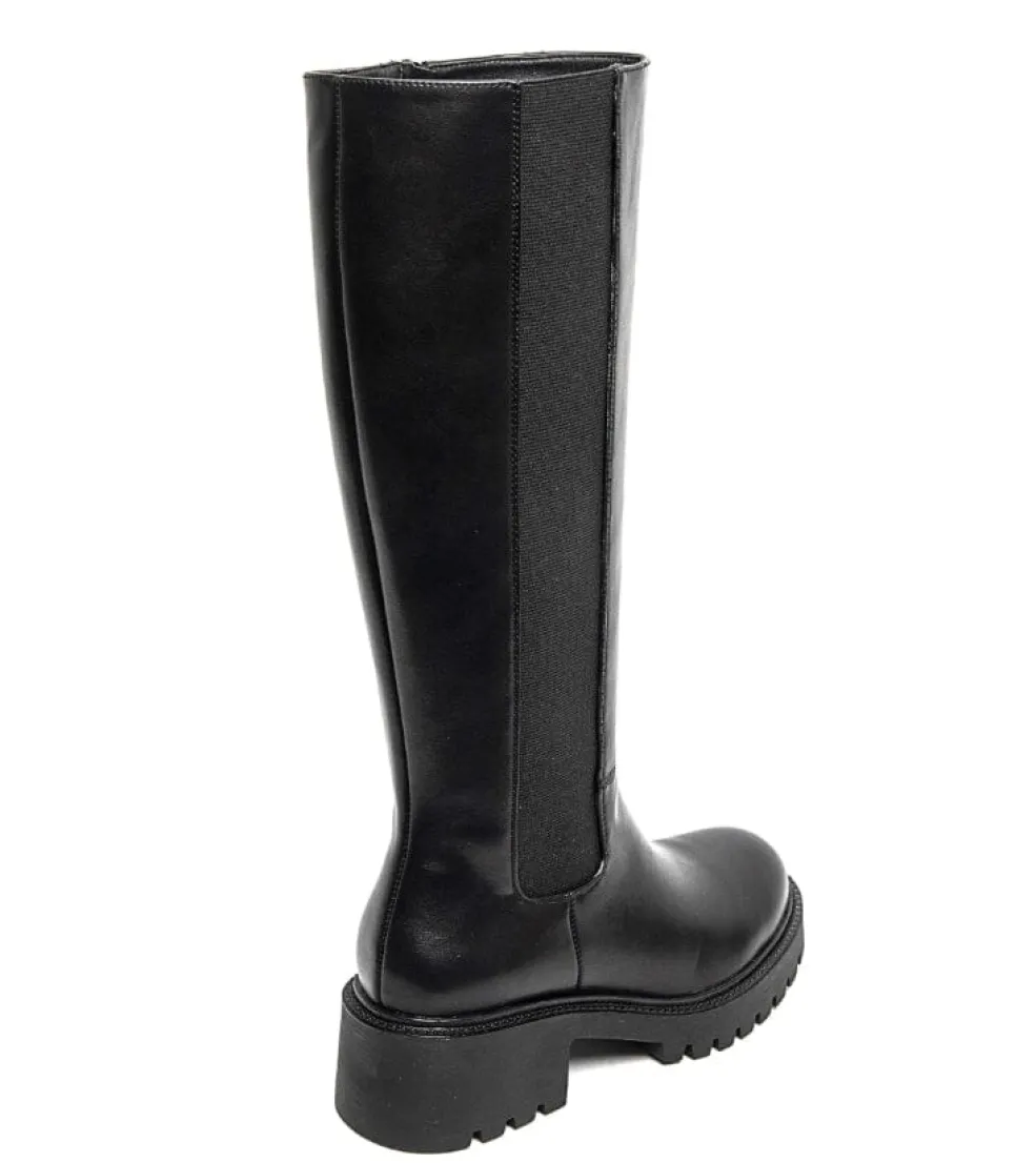 Sorte støvler fra Bloom, lavet af syntetisk materiale. Støvlerne har et højt skaft og en chunky sål med et markant mønster.