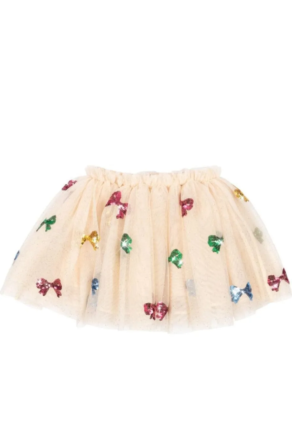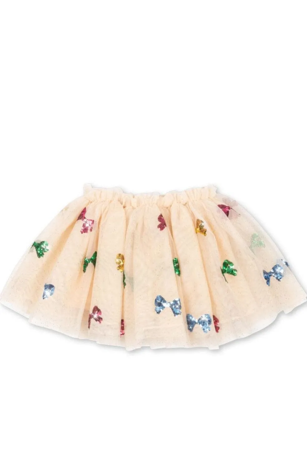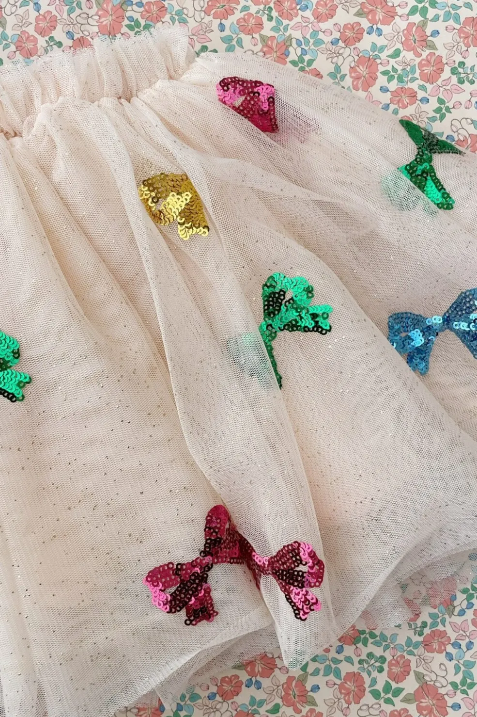 Nederdel fra Konges Sløjd i let polyester med farverige paillet-sløjfer på hvidt stof. Nederdelen har flæser og en elastisk talje.
