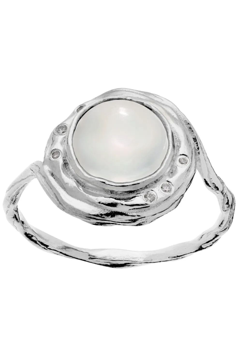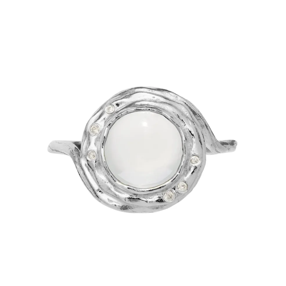 Sølvfarvet ring fra Maanesten med en rund hvid månesten i midten. Ringen har et bølget bånd med en organisk tekstur og små hvide zirconia-sten omkring månestenen.