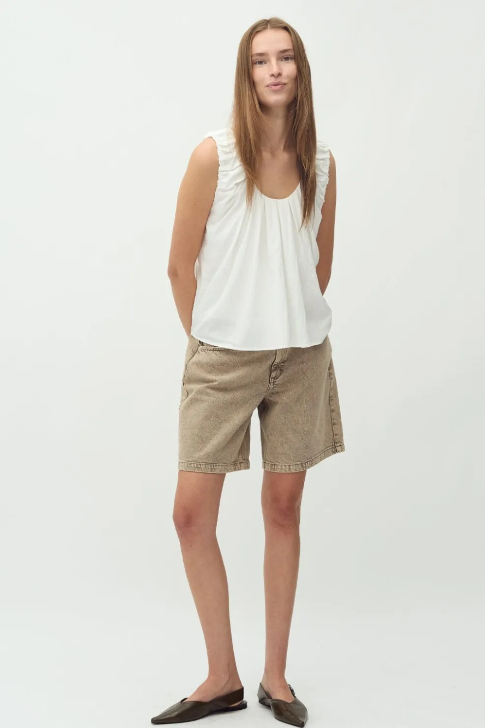 Hvid top fra MbyM med rynkede detaljer ved skuldrene og åben ryg. Toppen har en rund halsudskæring og en let struktur i stoffet.