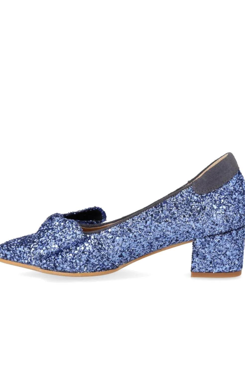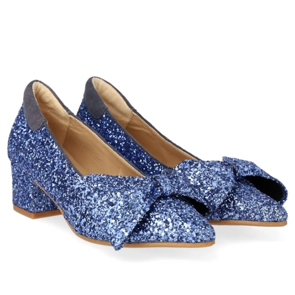Stiletter fra Angulus i mørkeblå med glitter. Skoene har spids tå, skindfor og sløjfedetaljer, der gør dem velegnede til festlige anledninger.