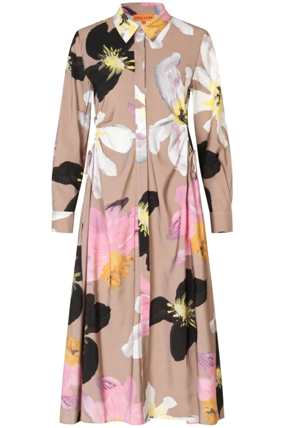 Skjortekjole fra Stine Goya med beige baggrund og store blomster i sort, pink, hvid og gul. Kjolen har lange ærmer og skjortekrave med bindebånd i taljen.