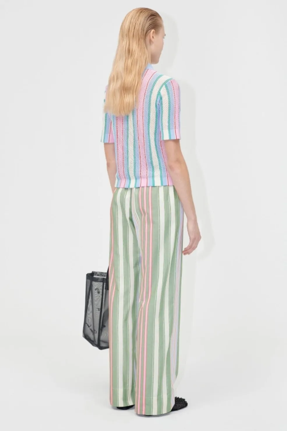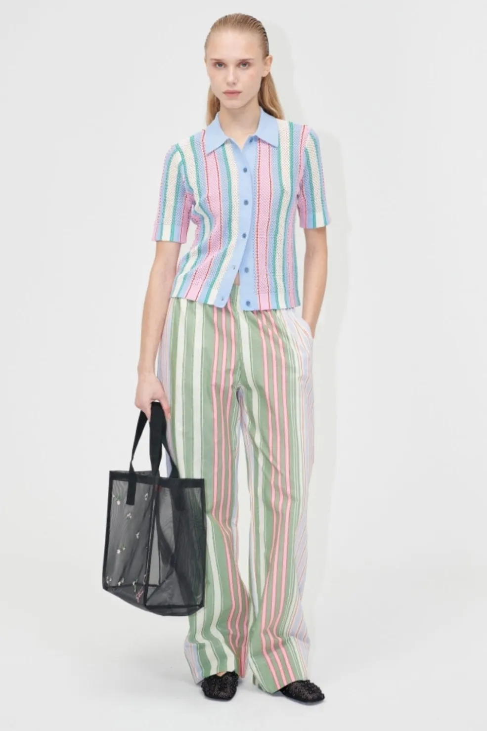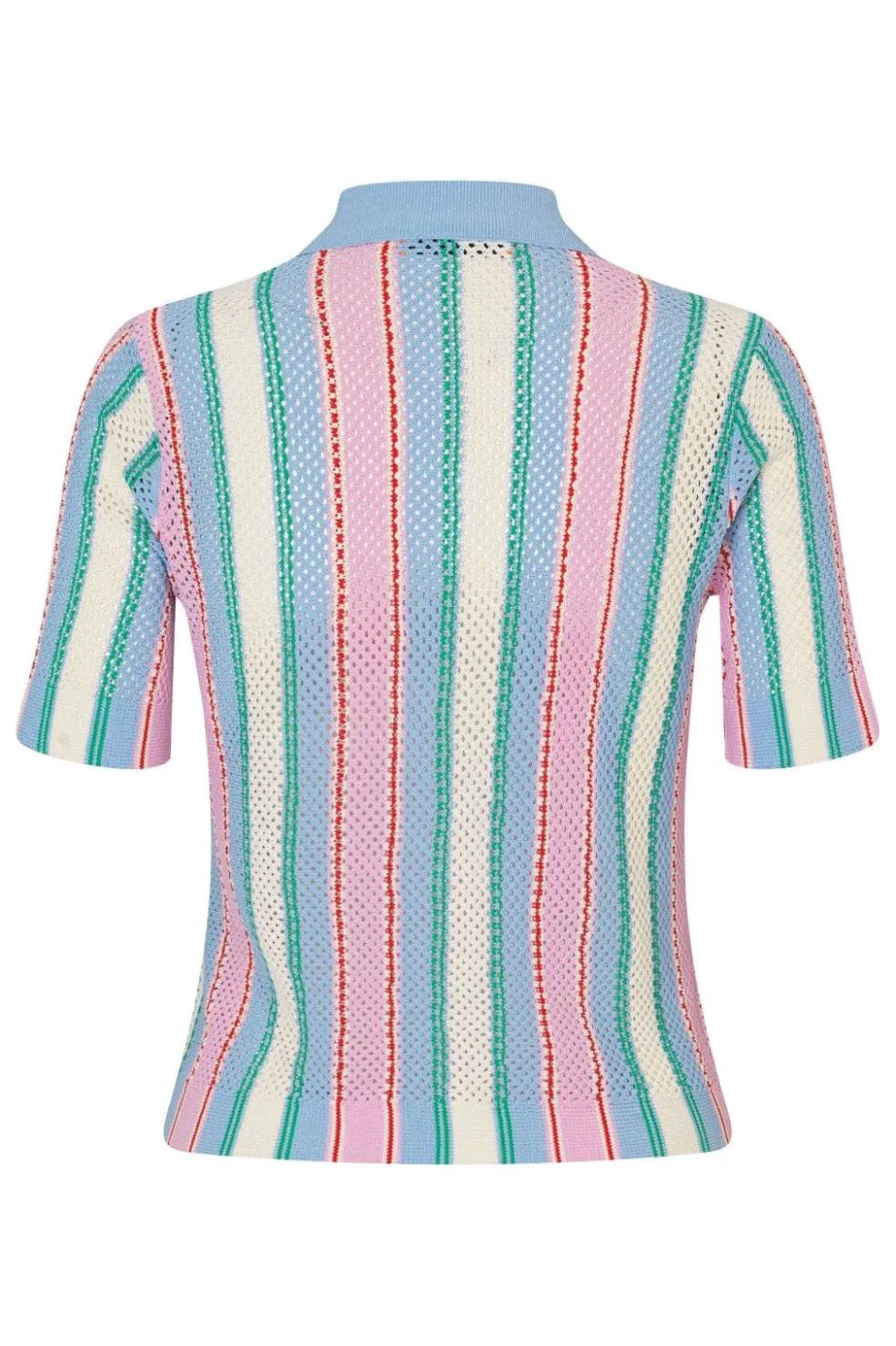 Kortærmet polo fra Stine Goya med hæklet strikdesign. Stribemønsteret går i lyse pasteller som lyseblå, lyserød og grøn. Polokraven og knapperne foran giver et klassisk præg.