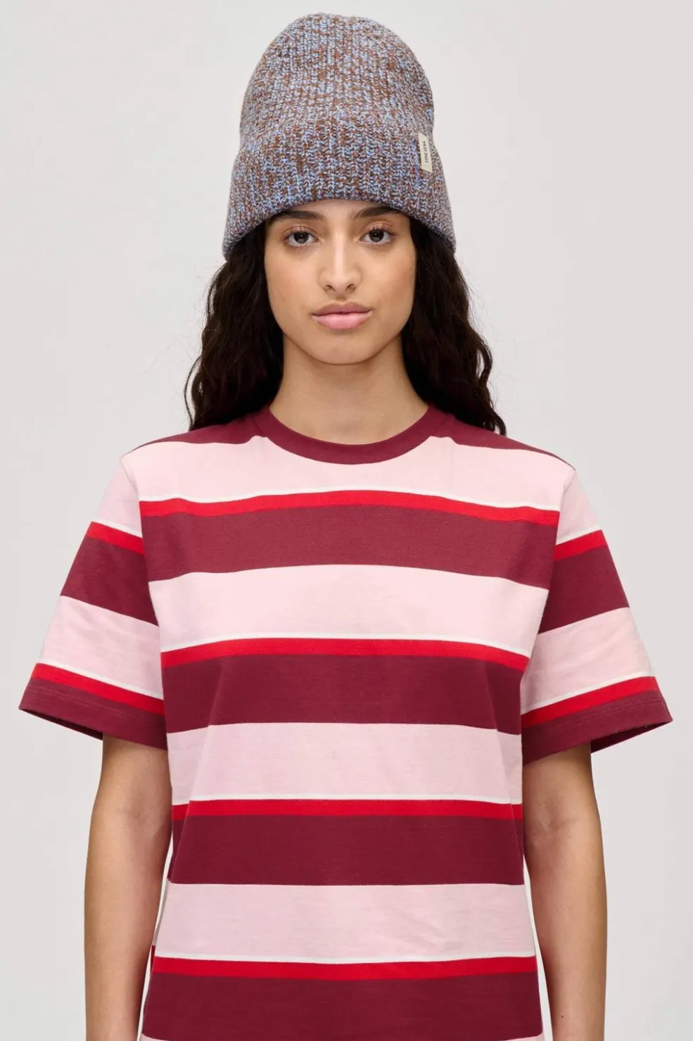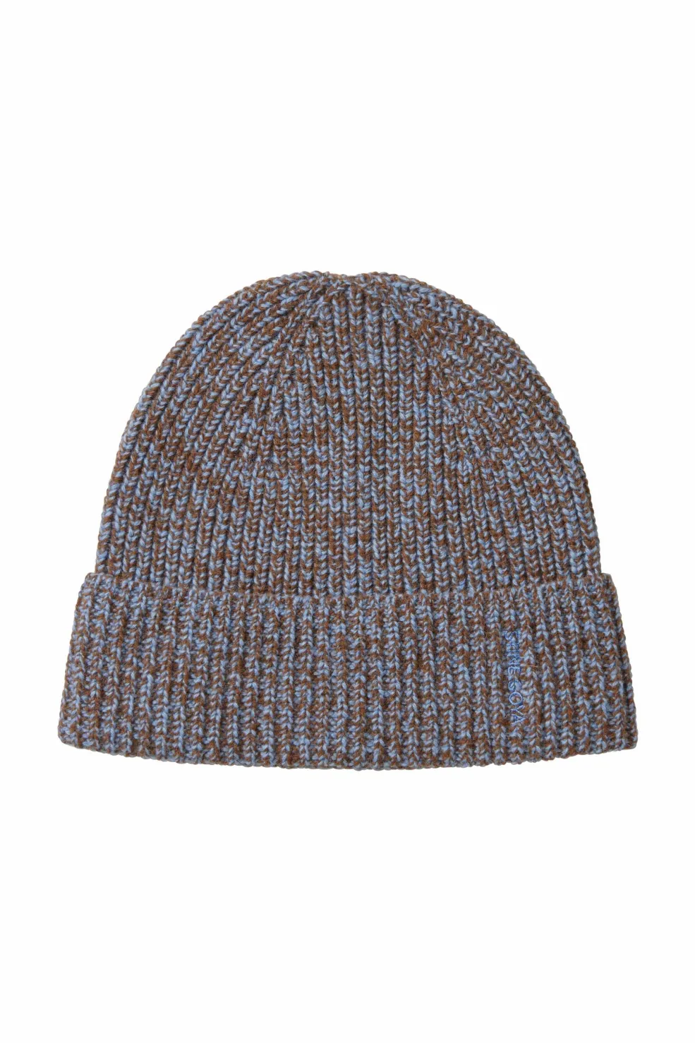 Strikket beanie fra Stine Goya i blå og brune farver. Beanieen har en ribbet strik og en foldet kant.