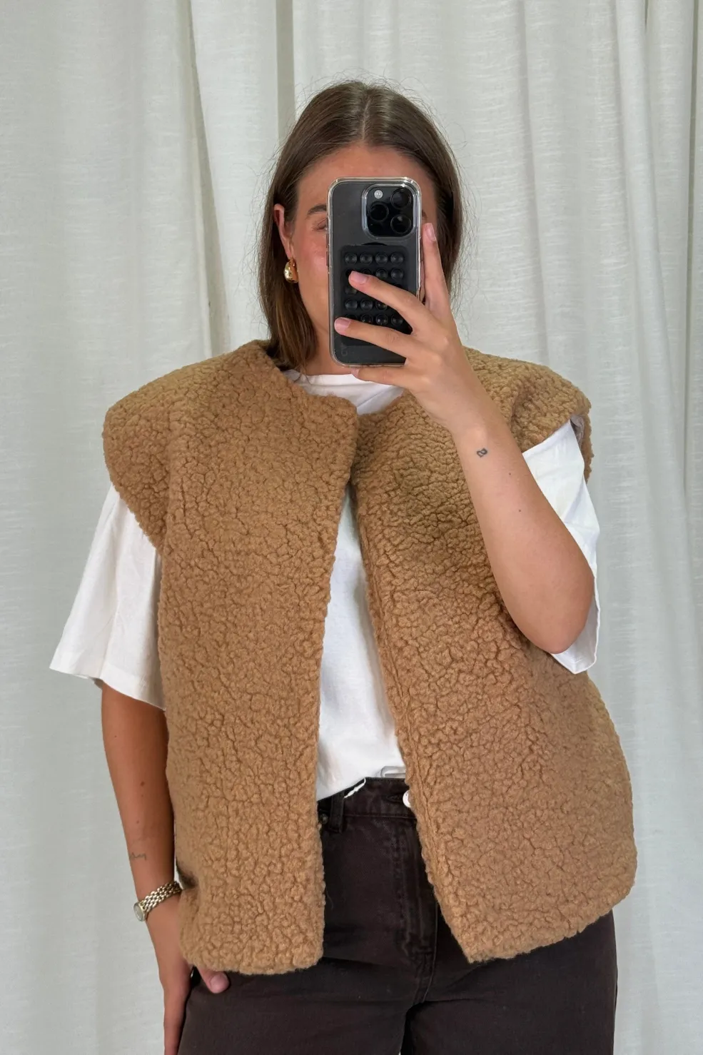 En vest fra A-bee i kamelfarvet nuance. Overfladen har en struktureret teddy-lignende tekstur. Den har en åben front uden lukninger og et ærmeløst design.