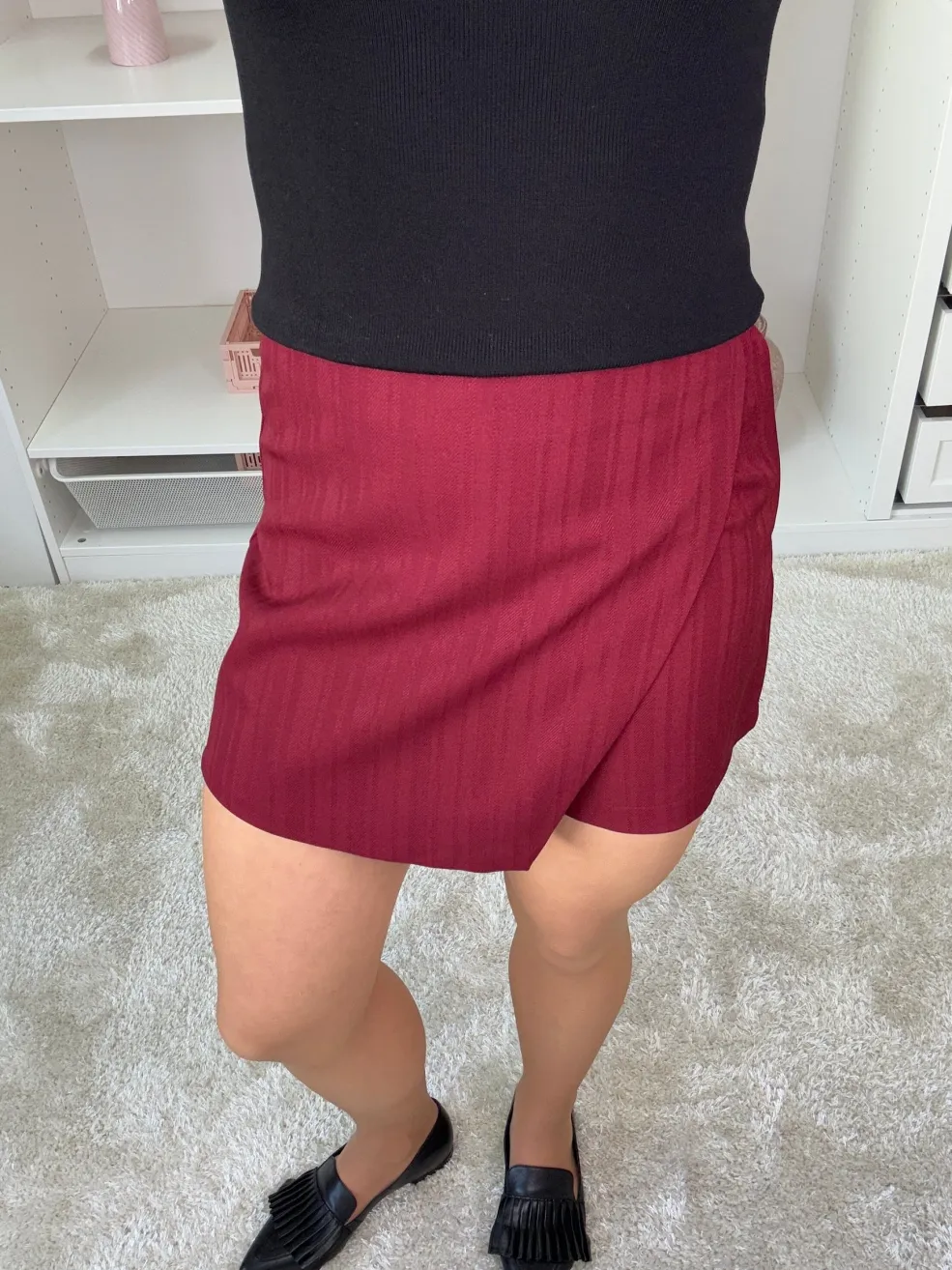 Nederdel fra A-bee i dyb burgunderfarve med pinstripe-mønster. Den har flæsedetaljer og en lårlang længde, der gør den praktisk til både hverdag og fest.