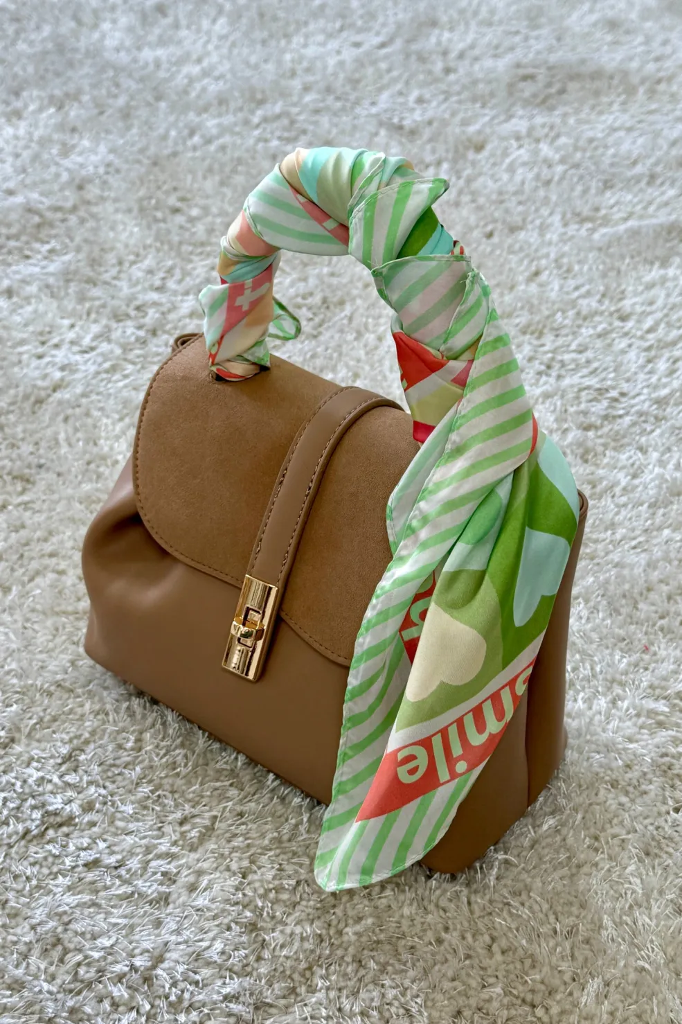 Grønt tørklæde fra A-bee med hjertemønster i pastelfarver. Tørklædet har en stribet kant og teksten Wild Heart Love Smile langs kanten.