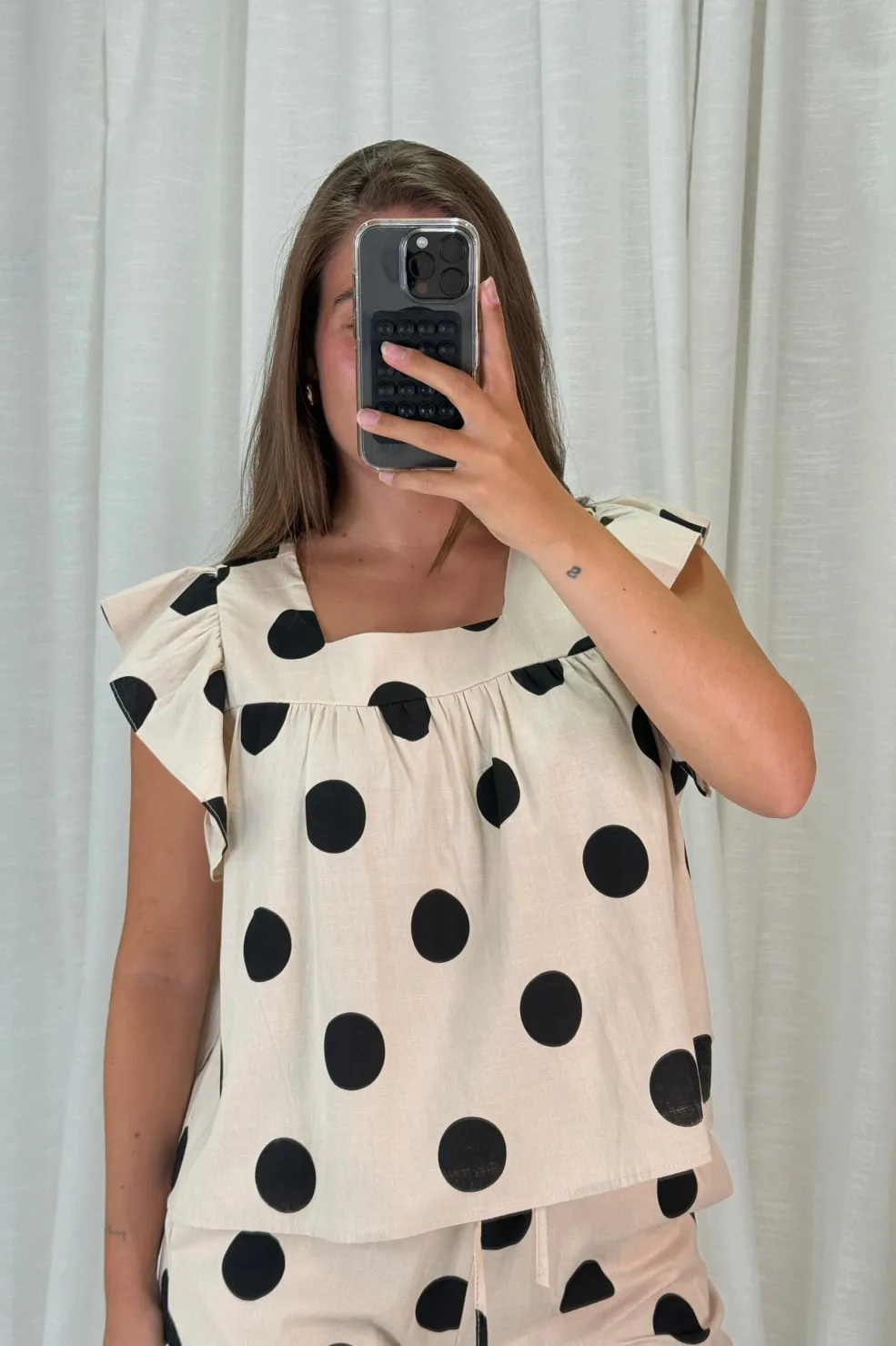 En cremefarvet skjorte fra A-bee med store sorte prikker. Skjorten er lavet af en blanding af bomuld, viskose og hør.