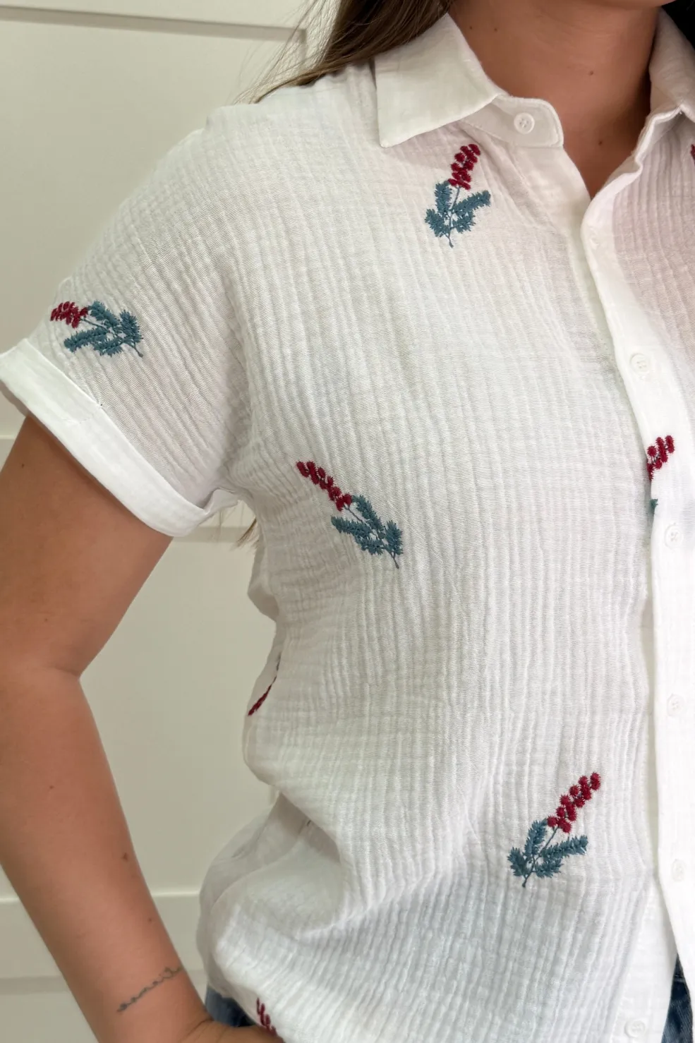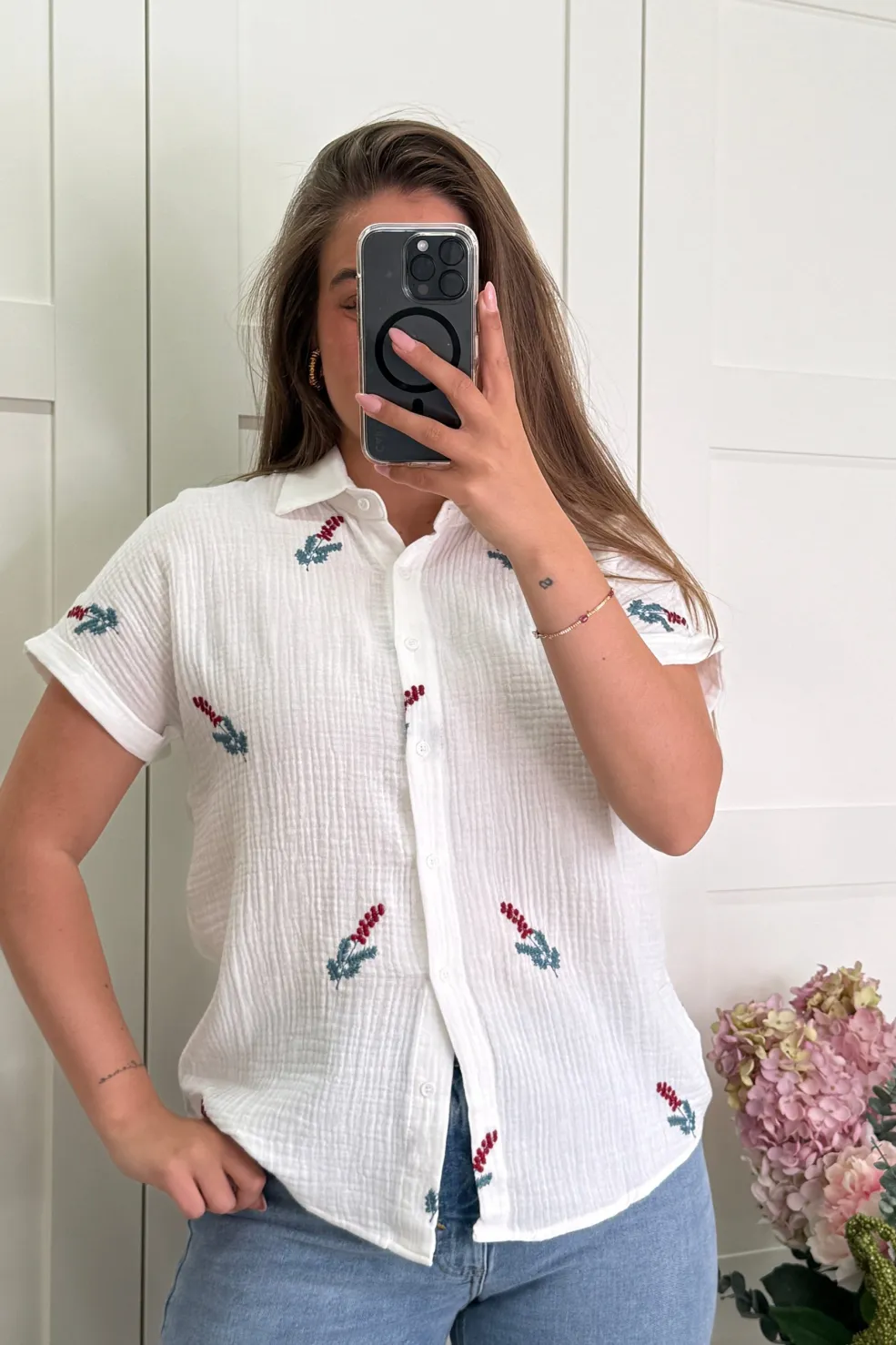 Hvid skjorte fra A-bee med rødt og blåt broderi. Skjorten har korte ærmer med ombuk og en løs pasform, der giver god bevægelsesfrihed.