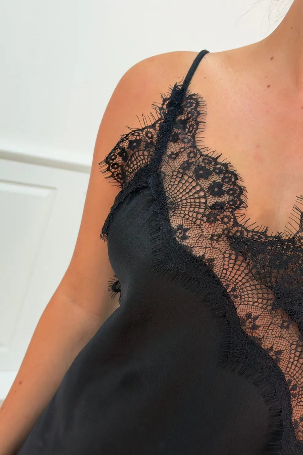Sort festkjole fra A-bee med V-hals og asymmetrisk kant. Kjolen har blonder detaljer langs halsudskæringen og kanten, som giver et fint udtryk til designet.