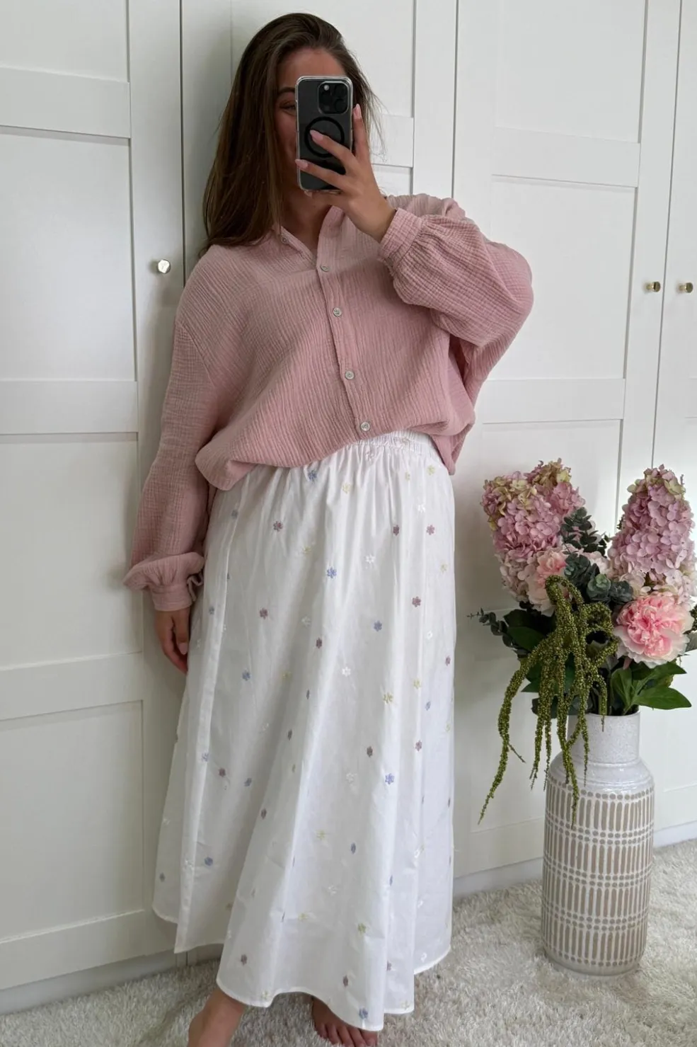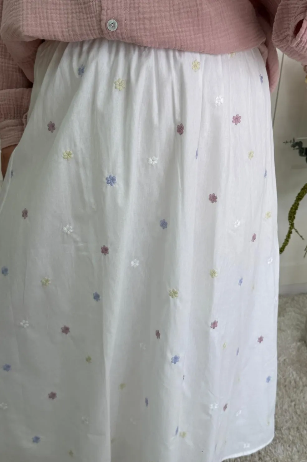Hvid nederdel fra A-bee med broderede blomster i lilla, gul og rosa. Den har en løs pasform og kalvelængde, der gør den anvendelig til både hverdag og fest.