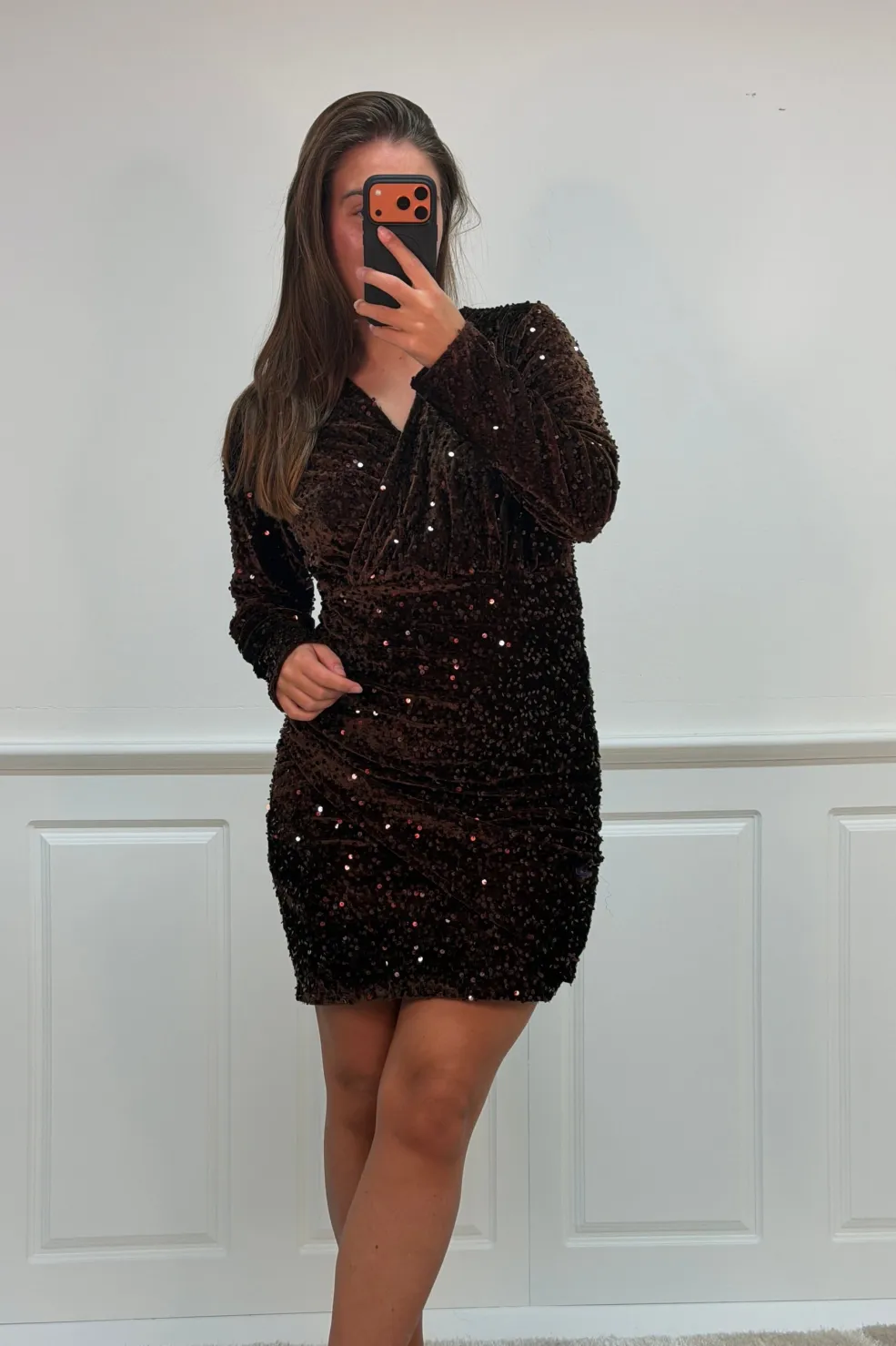 Mørkebrun kjole fra A-bee med pailletter over det hele. Kjolen har en tætsiddende pasform og går til midt på låret.