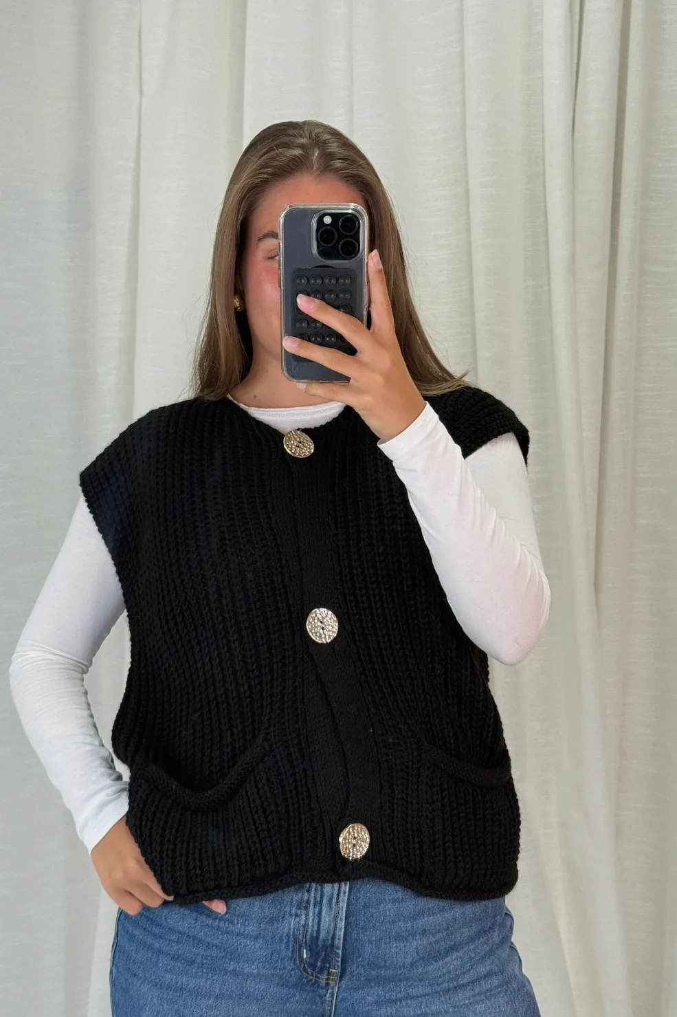 Sort vest fra A-bee, lavet af 100 % akryl. Vesten har knaplukning og en rund halsudskæring. Det ærmeløse design gør den velegnet til lag-på-lag-styling.