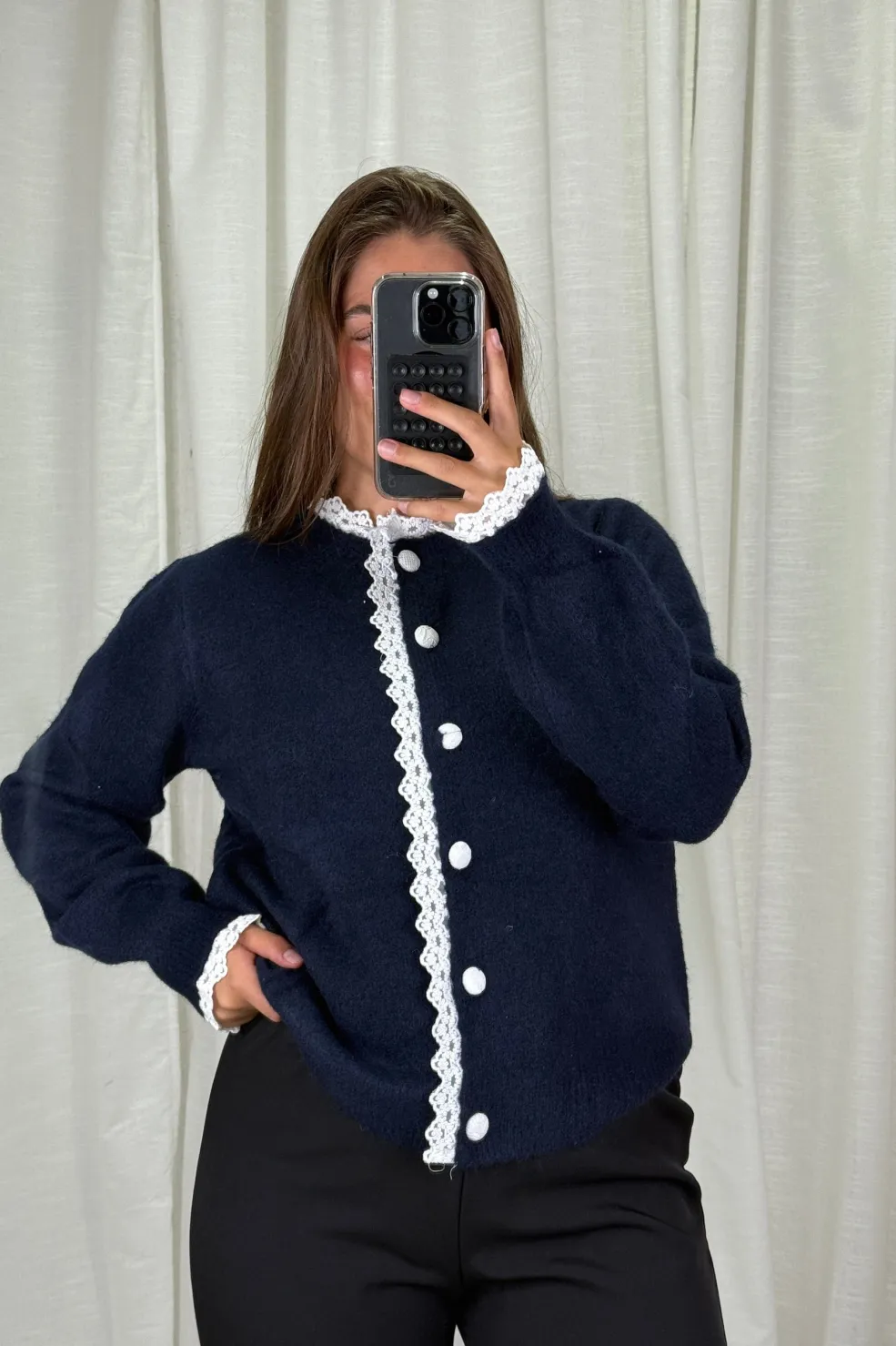 Mørkeblå striktrøje fra A-bee med hvide knapper langs fronten og hvid blondekant ved halsudskæringen og manchetterne.