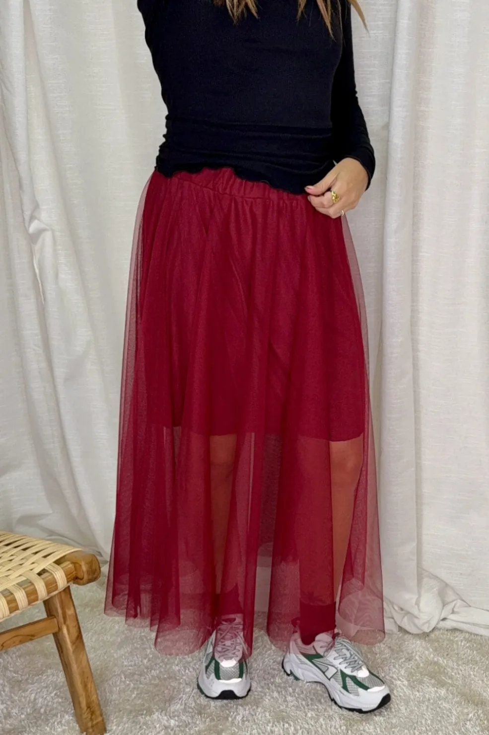Burgunder nederdel fra A-bee med to-lags design. Det transparente tyl og den dybe røde farve skaber en nederdel, der kan styles til både hverdag og fest.