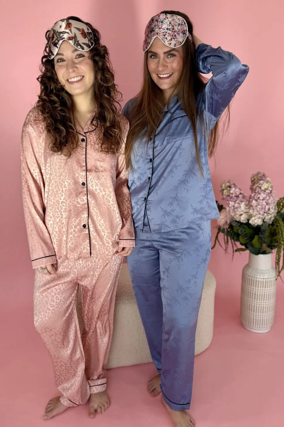 Blå pyjamas fra A-bee med bambusblad-mønster og sort kantebånd. Sættet består af en skjorte med brystlomme og matchende bukser i et skinnende stof.