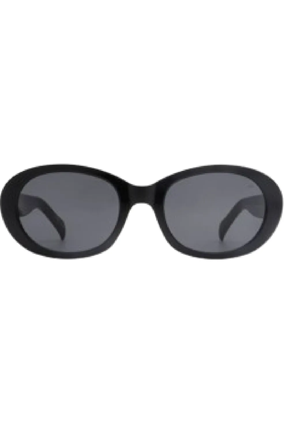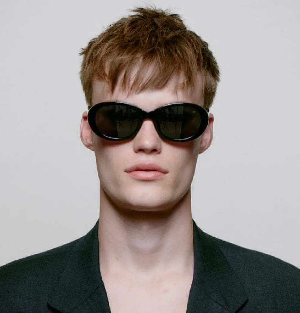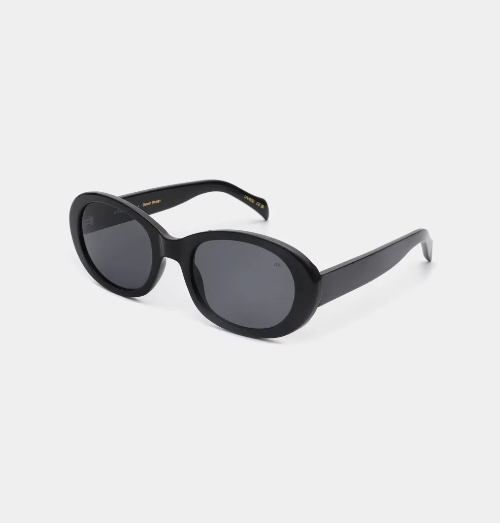 Sorte solbriller fra A. Kjærbede med oval ramme og kraftige sider. Stellet har en afrundet form med mørke glas og tyk kant, der giver god beskyttelse mod sidelys.