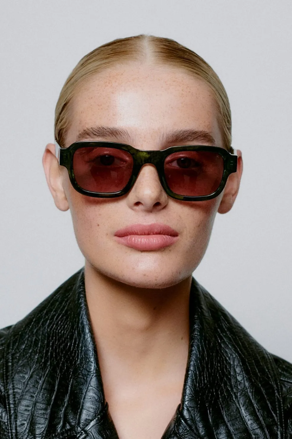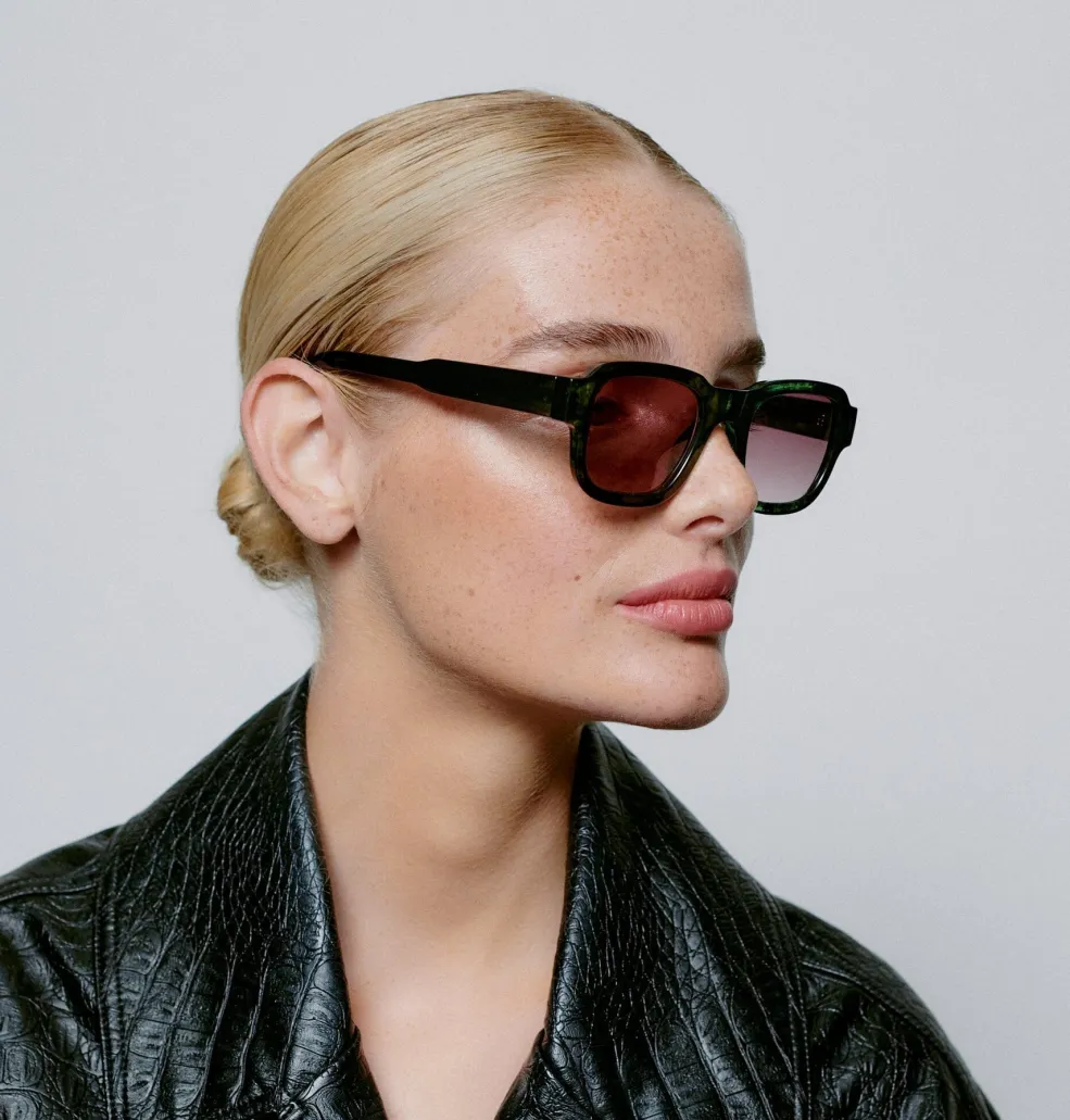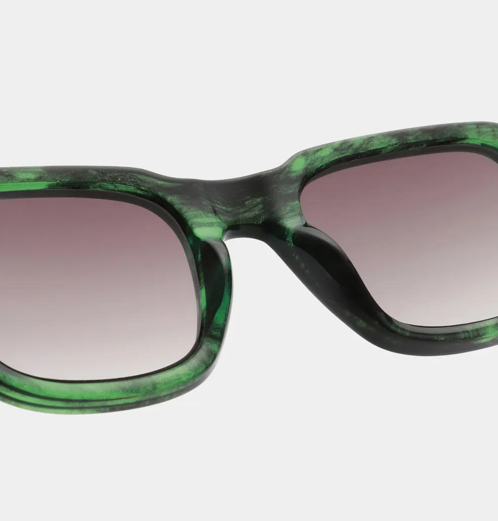 Solbriller fra A. Kjærbede med grøn marmoreret, transparent stel. Brillerne har UV400-beskyttelse og er udstyret med optiske kvalitetshængsler samt formbare brillestænger med metalkerner.