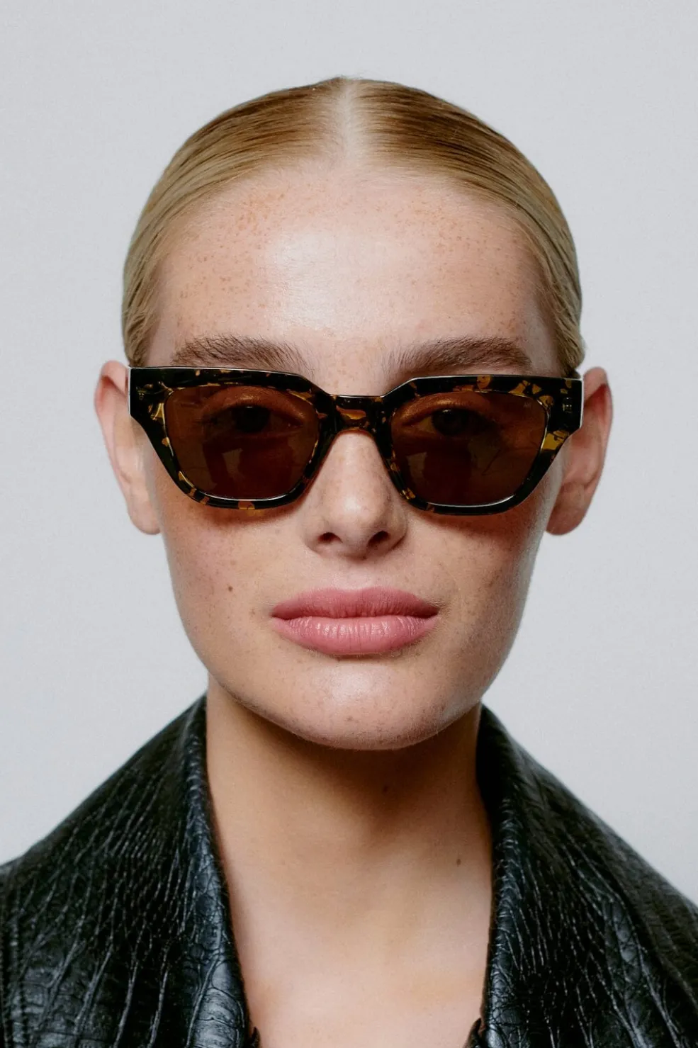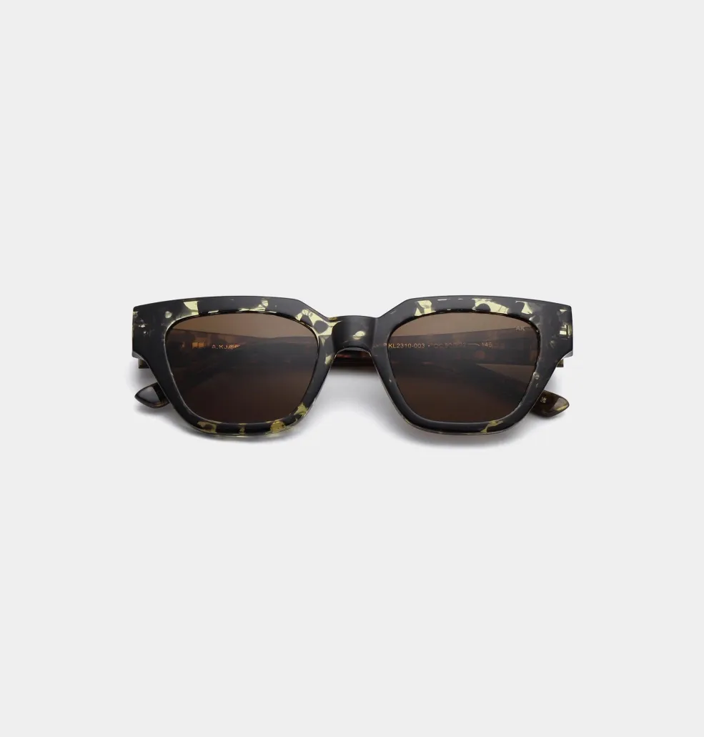 Rektangulære solbriller fra A. Kjærbede i sort og gul skildpaddeskal. Stellet har brune tonede linser og er lavet af polycarbonat med formbare stænger til individuel tilpasning.