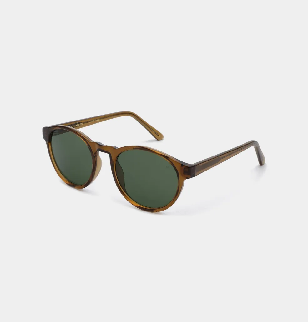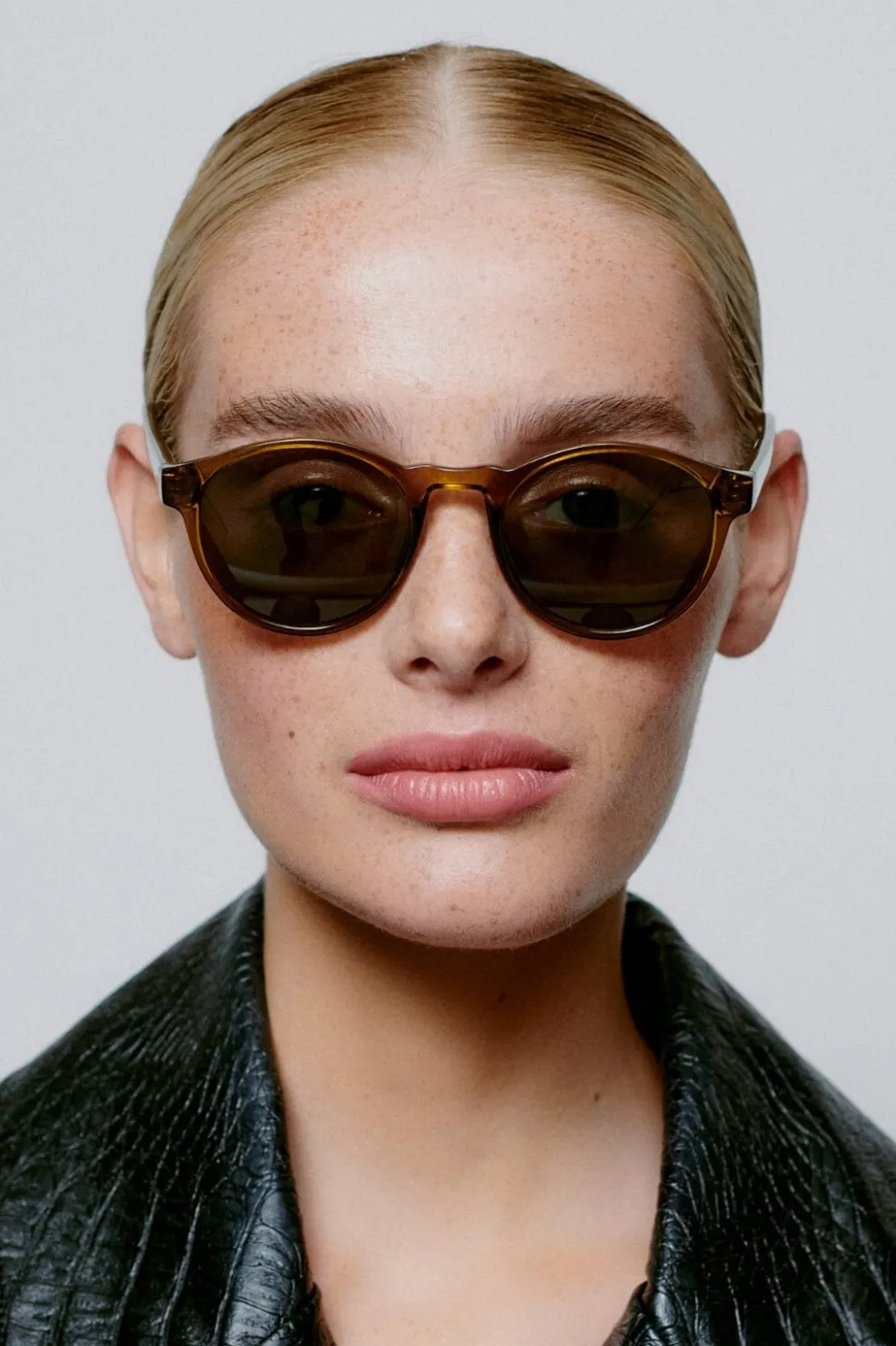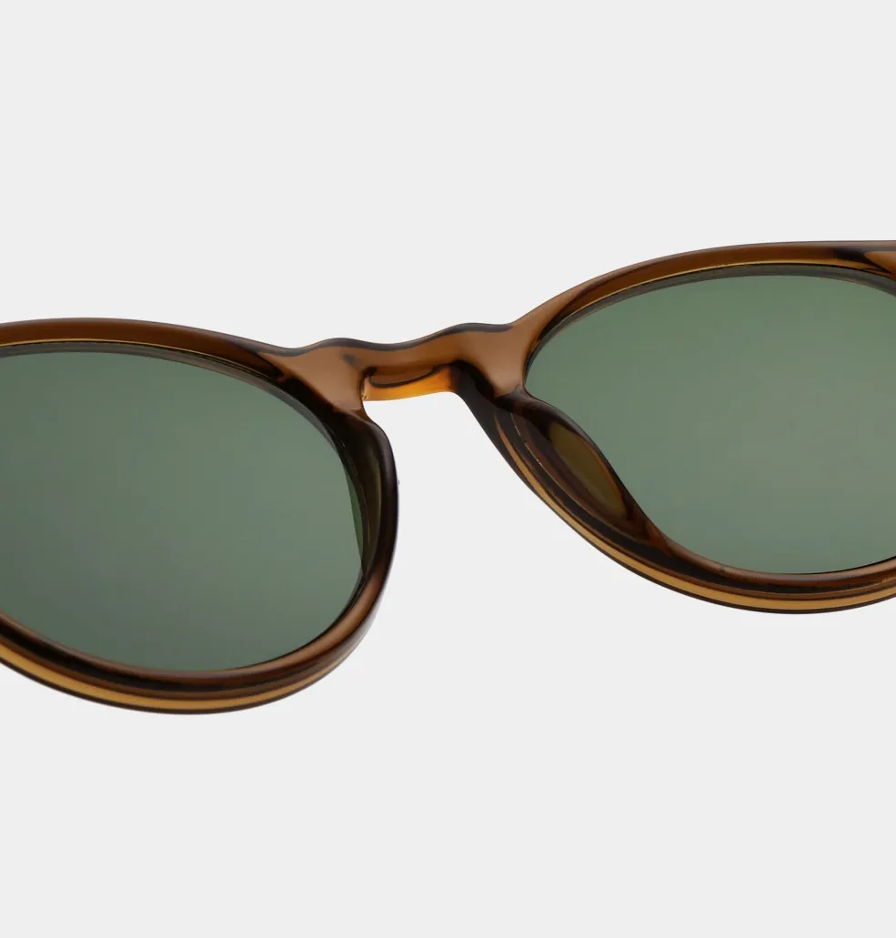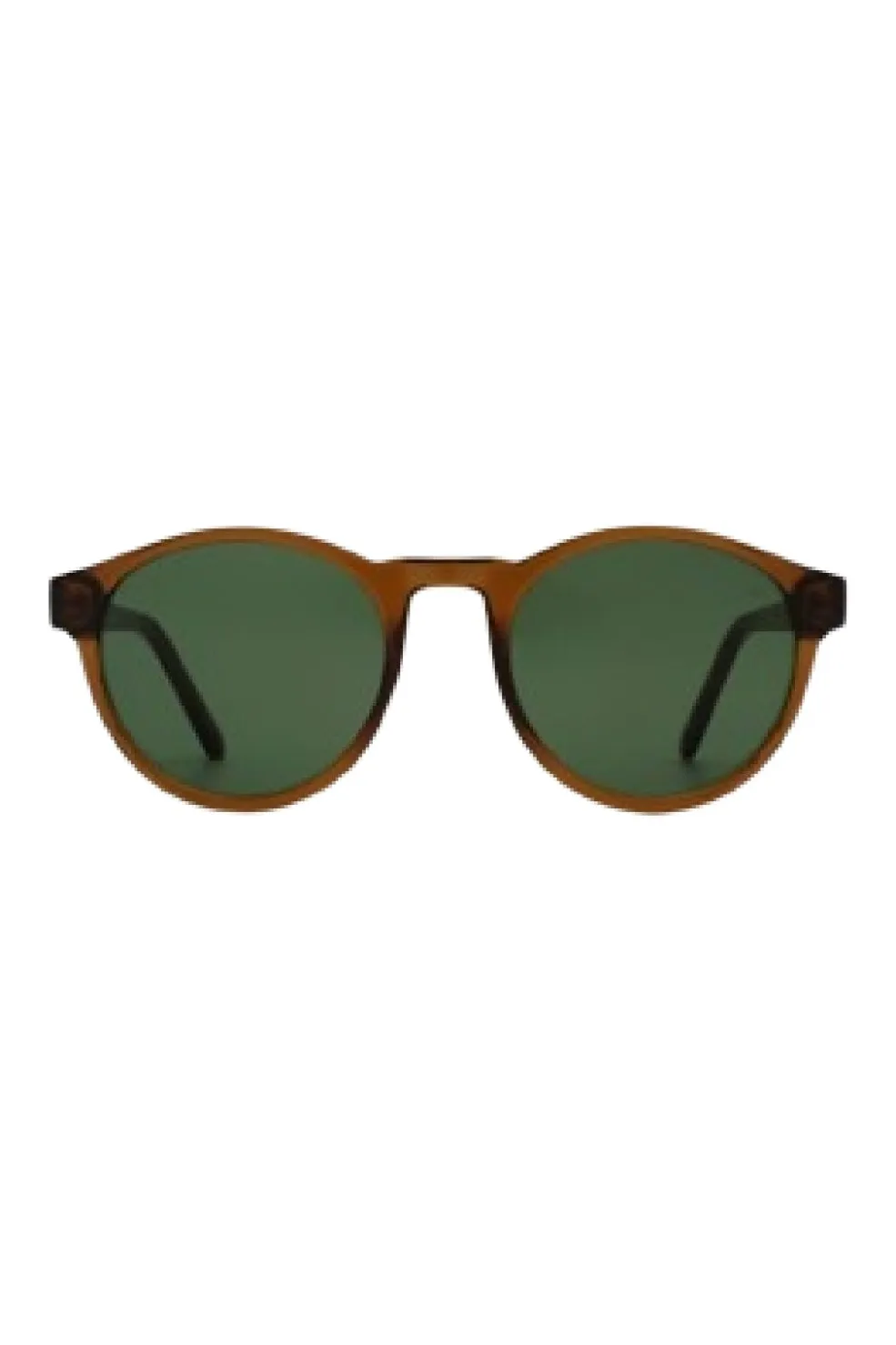 Solbriller fra A. Kjærbede med rund oval form. Stellet er fremstillet i røgfarvet, transparent polycarbonat med grønne linser og brune detaljer.