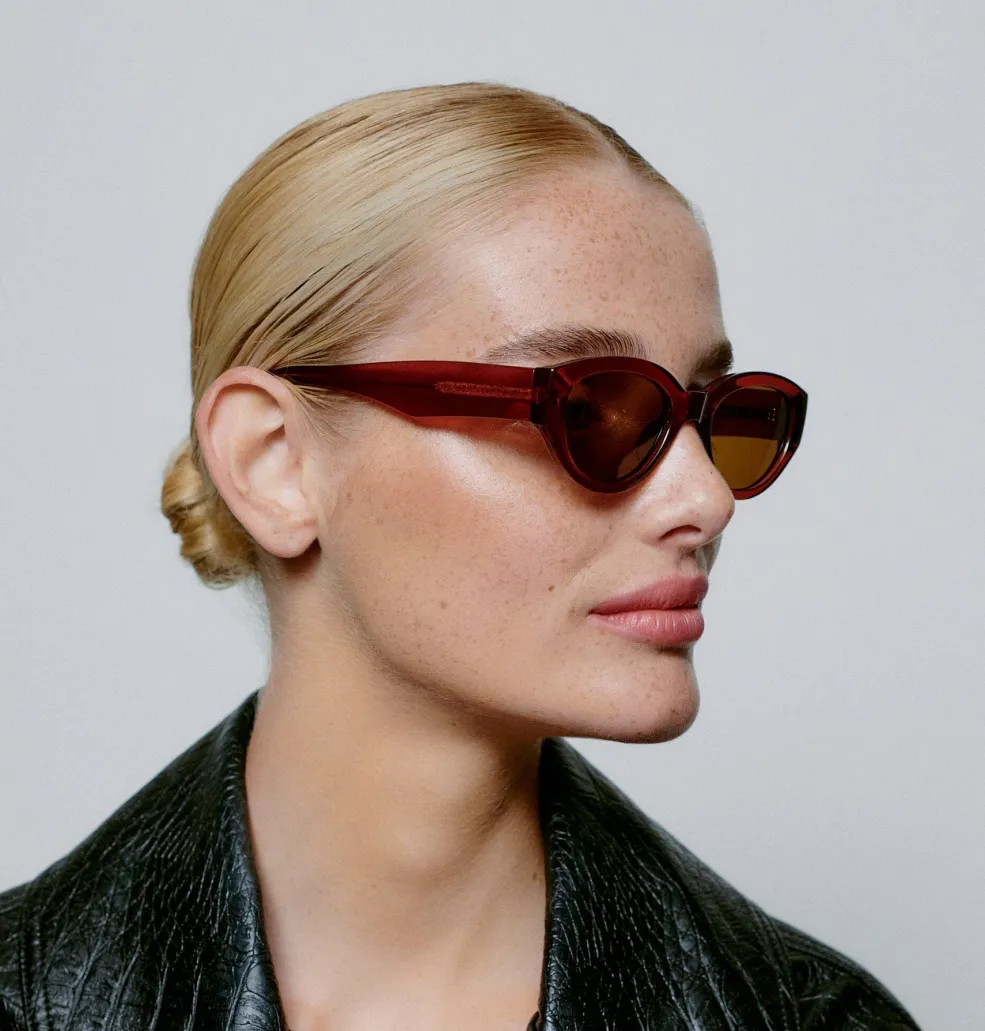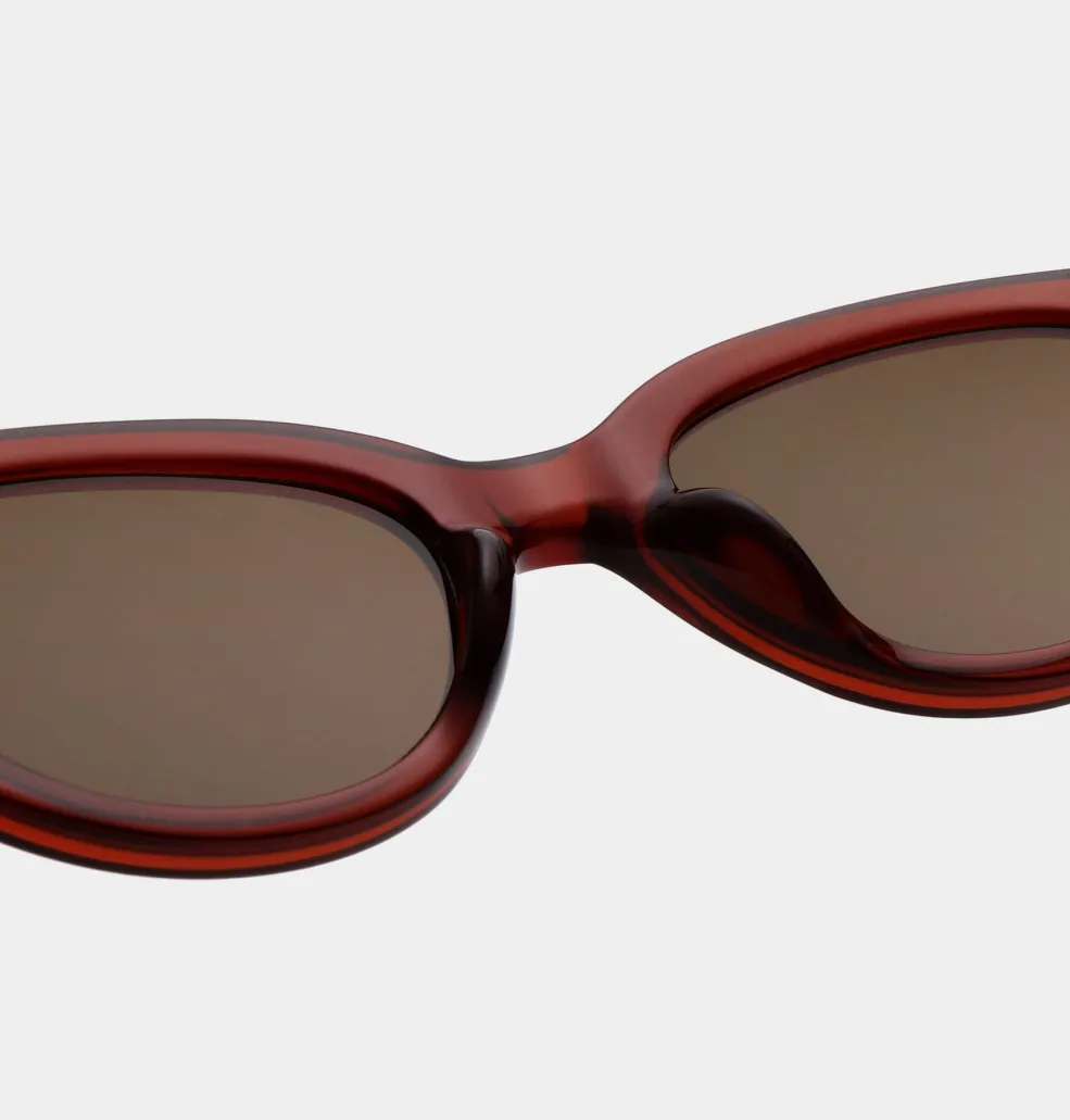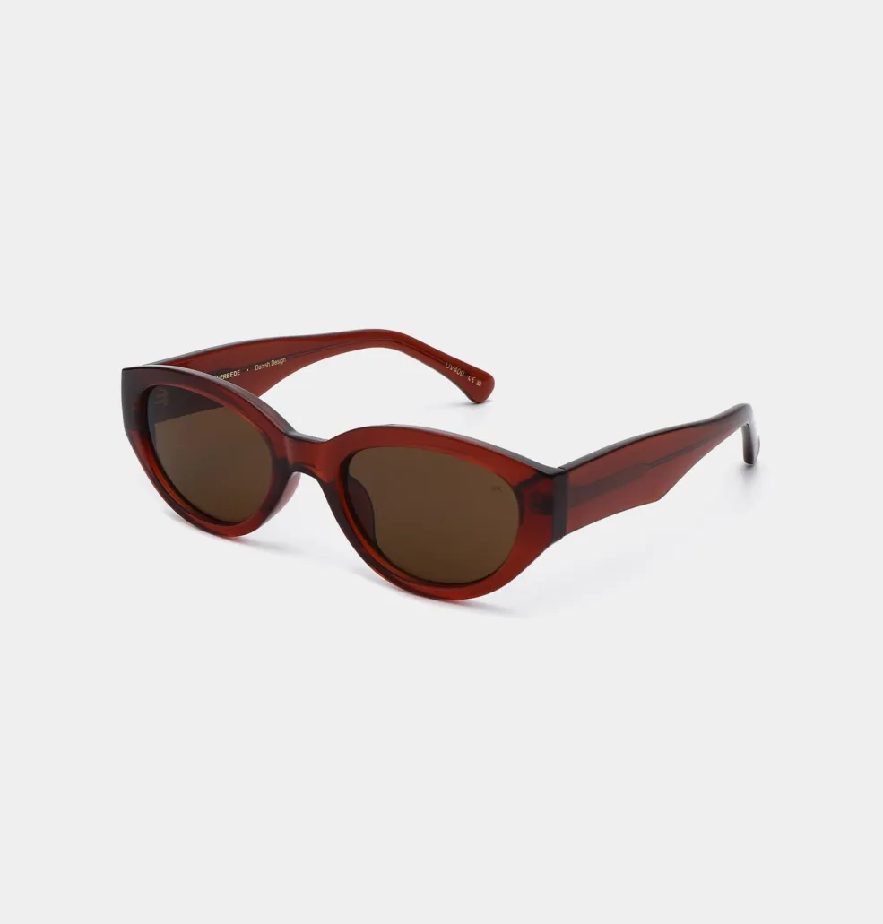 Brune solbriller fra A. Kjærbede med katteøjeform. Brillerne er lavet af polycarbonat med en blank overflade og har formbare stænger med metalkerner.