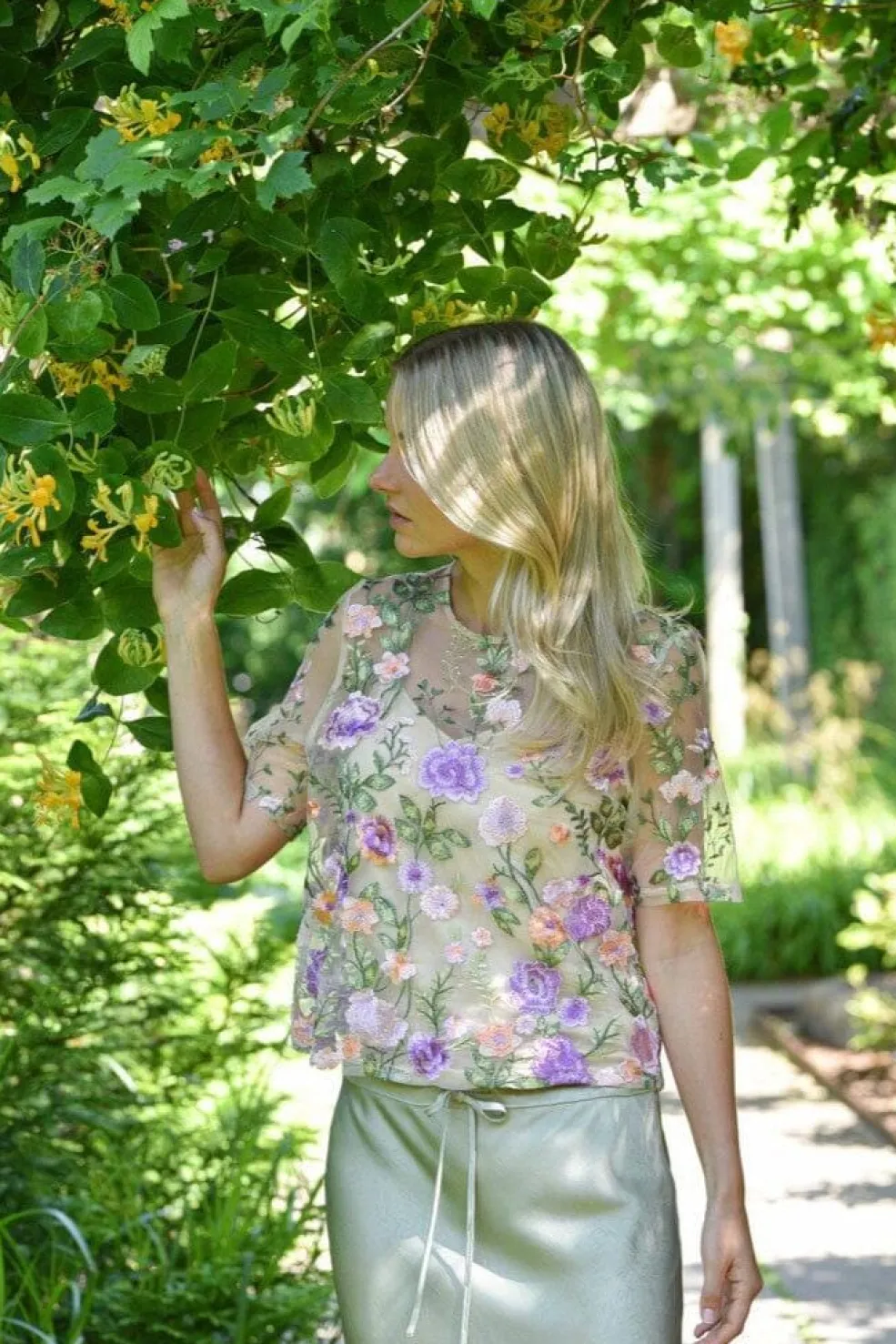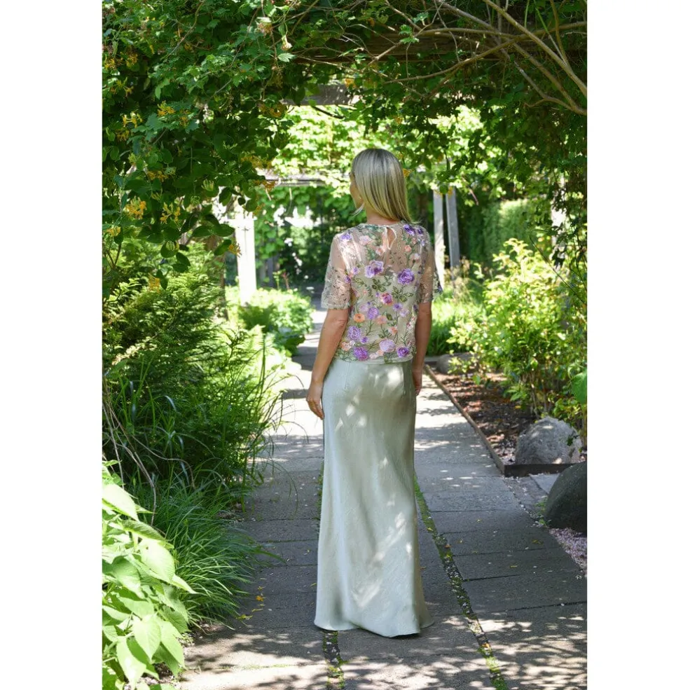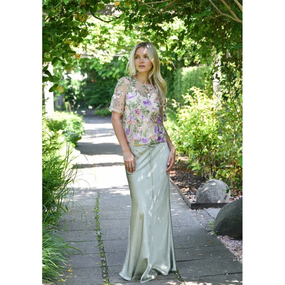 Bluse fra A-View, lavet af transparent mesh i grønne og lilla nuancer. Blusen har broderede blomster og passer til både formelle og festlige anledninger.
