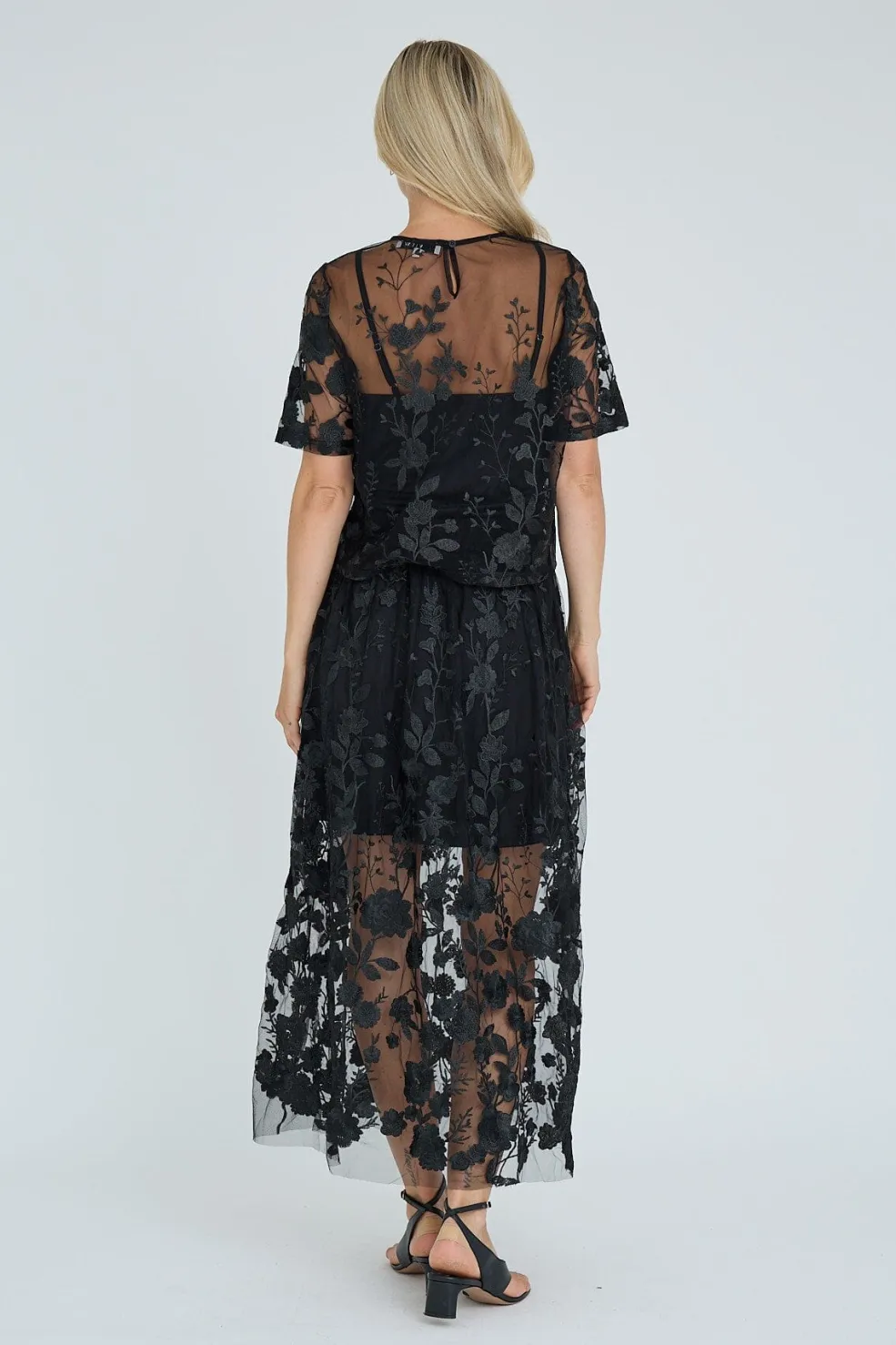 Sort bluse fra A-View, lavet af transparent mesh med broderede blomster. Blusen har korte, løse ærmer og en rund halsudskæring.