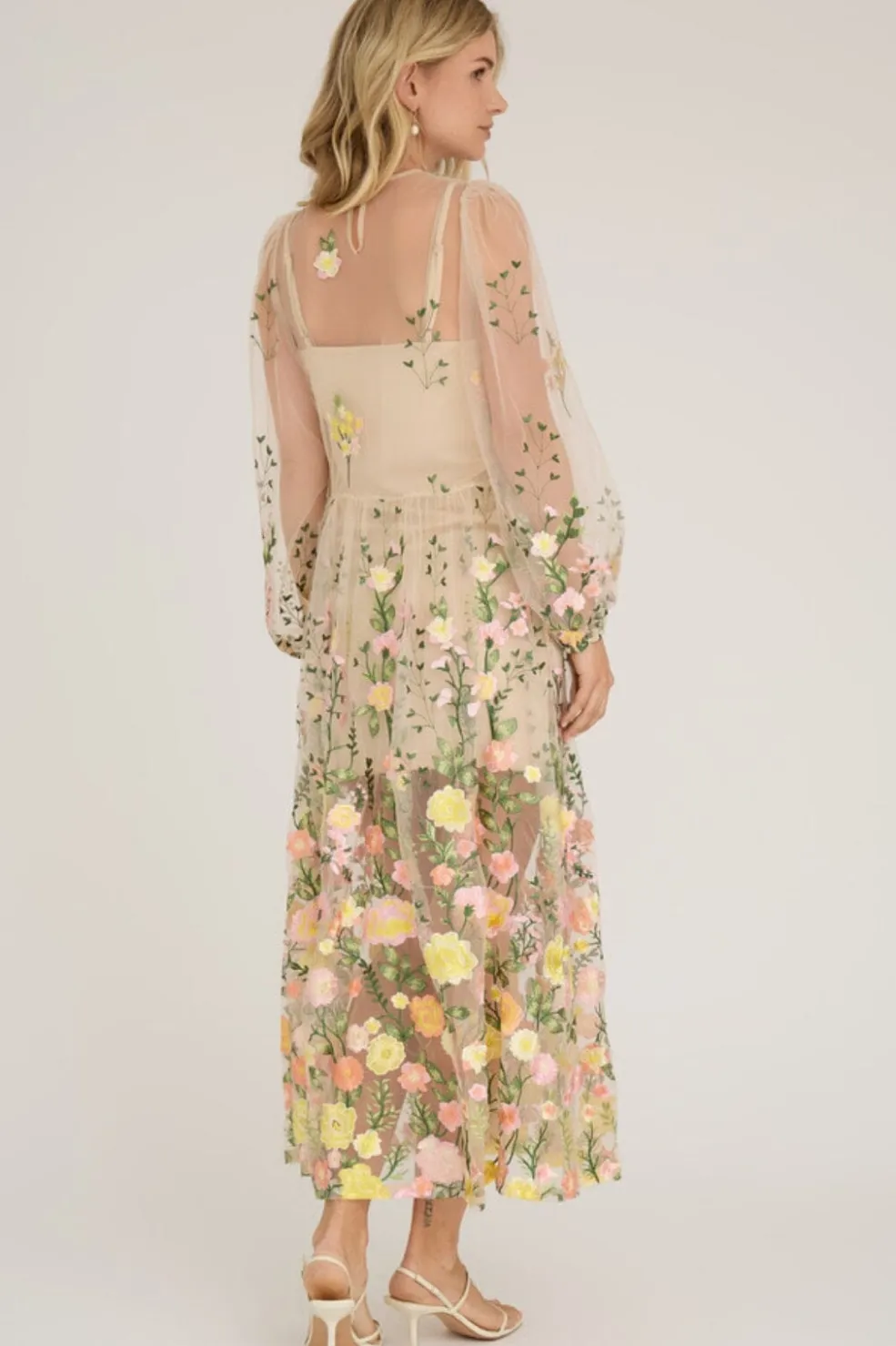 Sand/gul kjole fra A-View med broderede blomster i pink og gule nuancer. Den transparente mesh-kvalitet har lange ærmer med elastiske manchetter og en flydende nederdel i ankelængde.