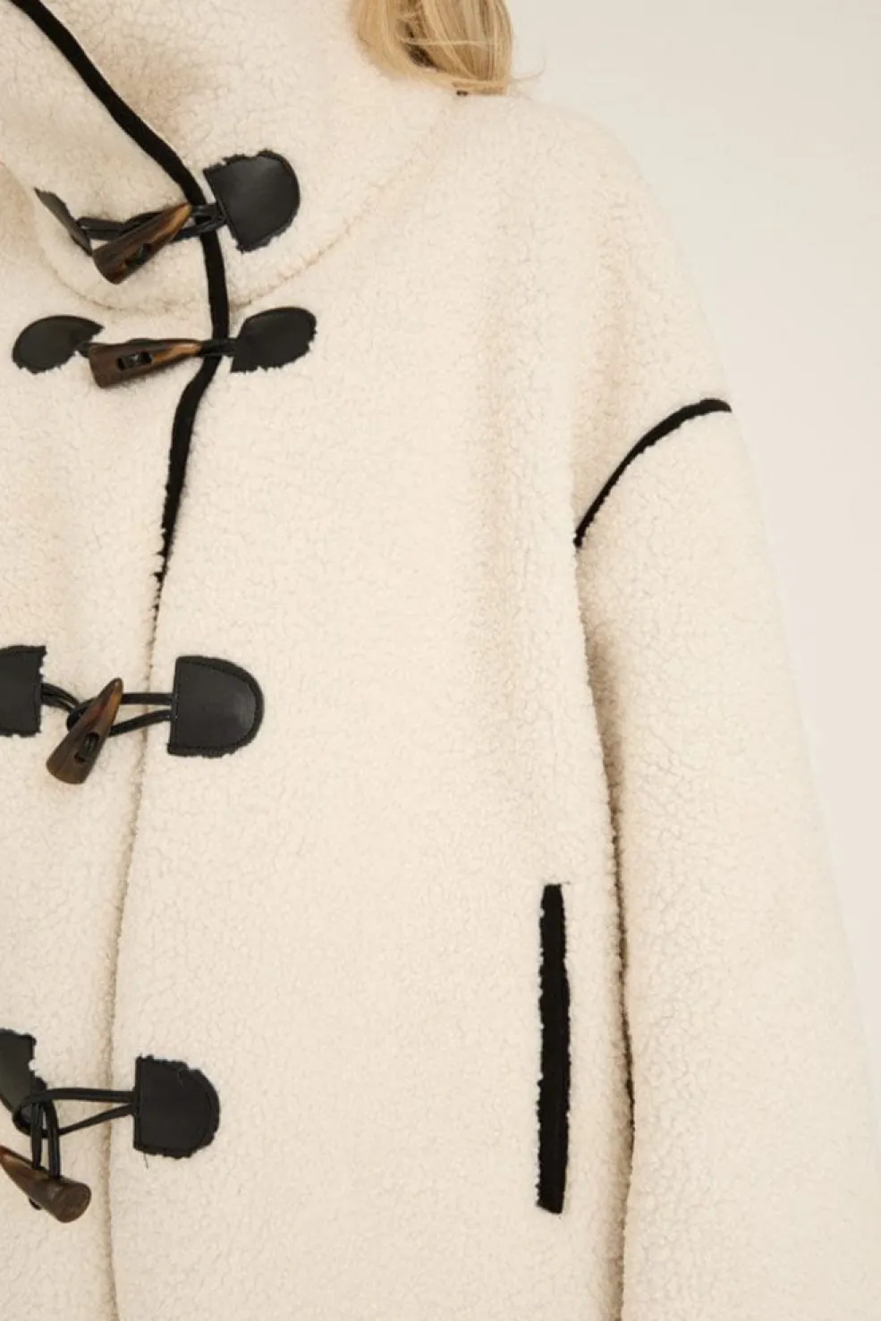 Kort jakke fra A-View i blød teddy-kvalitet. Den camelfarvede jakke har karakteristiske horn-toggles og sorte kontrastsyninger langs kanterne. Den høje krave og loose fit gør den praktisk til hverdagsbrug.