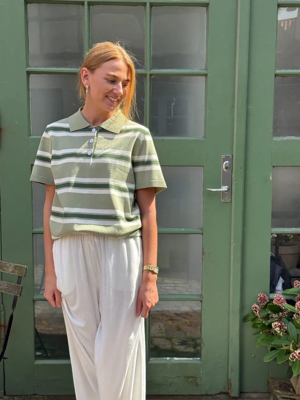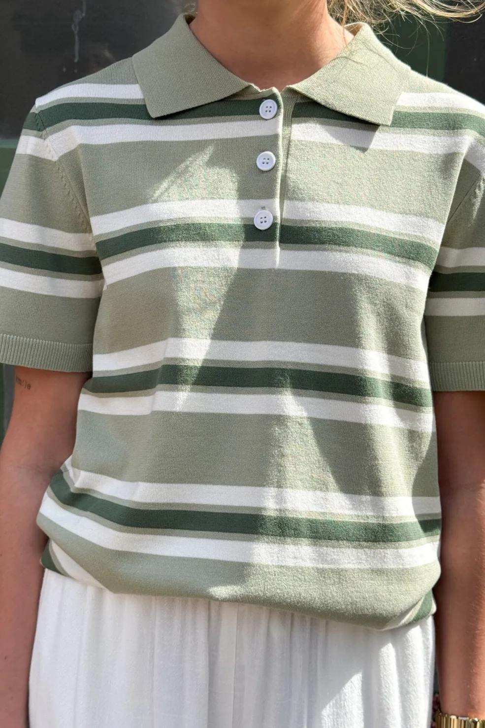 Strikket polobluse fra A-View med vandrette striber i støvet grøn og hvid. Blusen har en løs pasform med korte ærmer og tre knapper ved halsen.