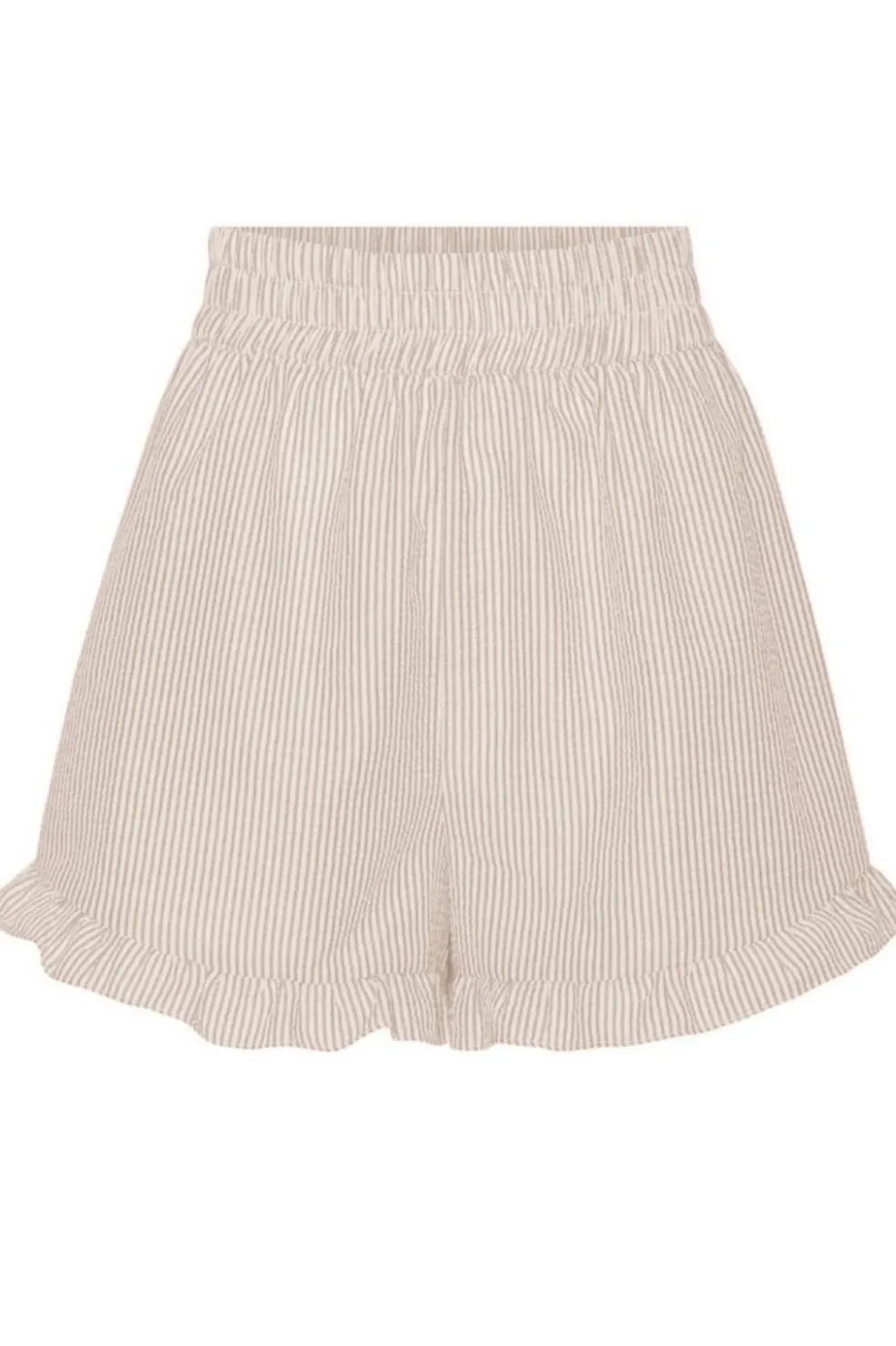 Stribede shorts fra A-View i sand og hvid. De har en løs pasform med høj talje og elastik. En flæsekant pryder kanten forneden, og shortsene er lavet i et let crepemateriale.