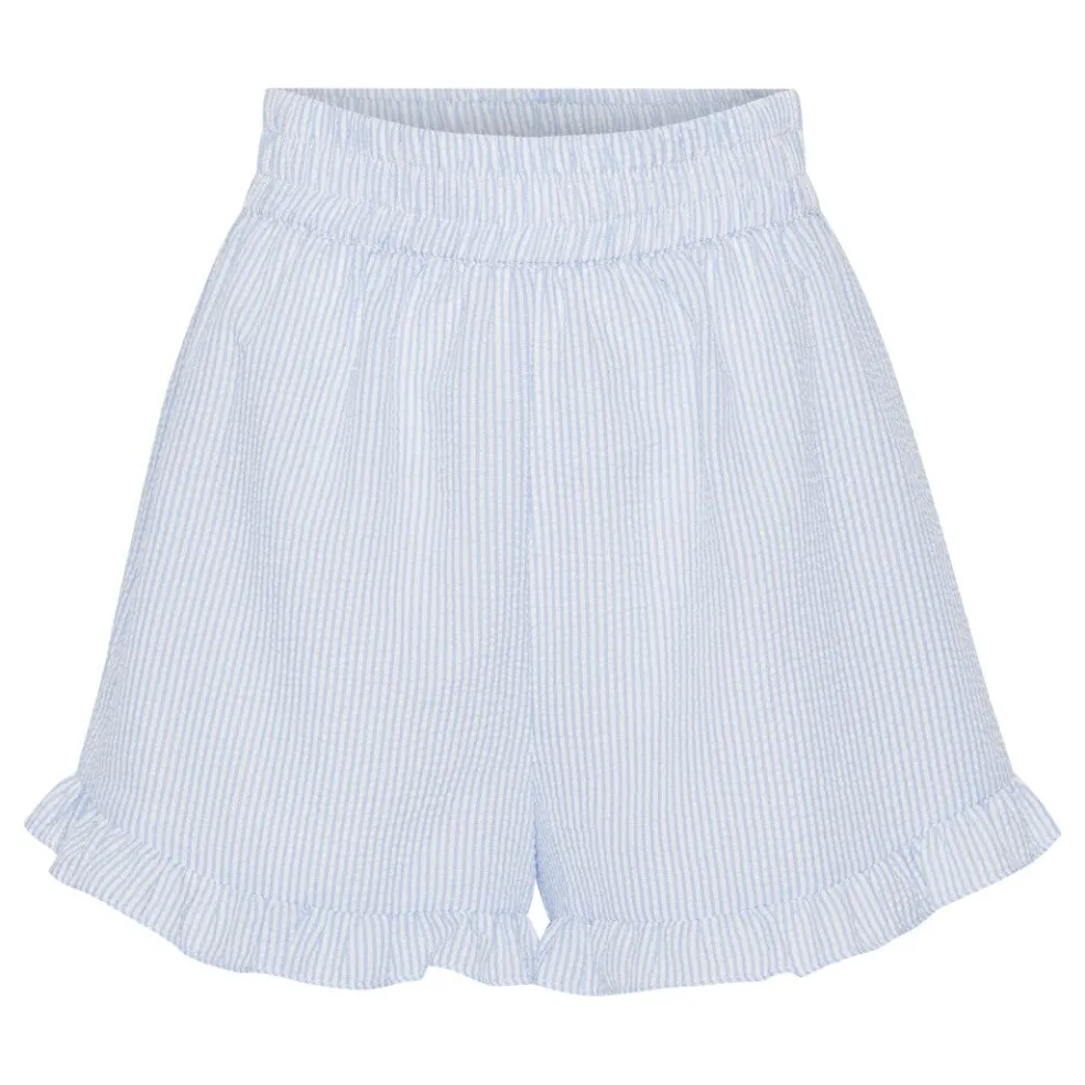 Stribede shorts i blå og hvid med flæsekant forneden. Den løse pasform og den elastiske talje giver god bevægelsesfrihed. Shortsene har et maritimt udtryk med deres blå og hvide striber.