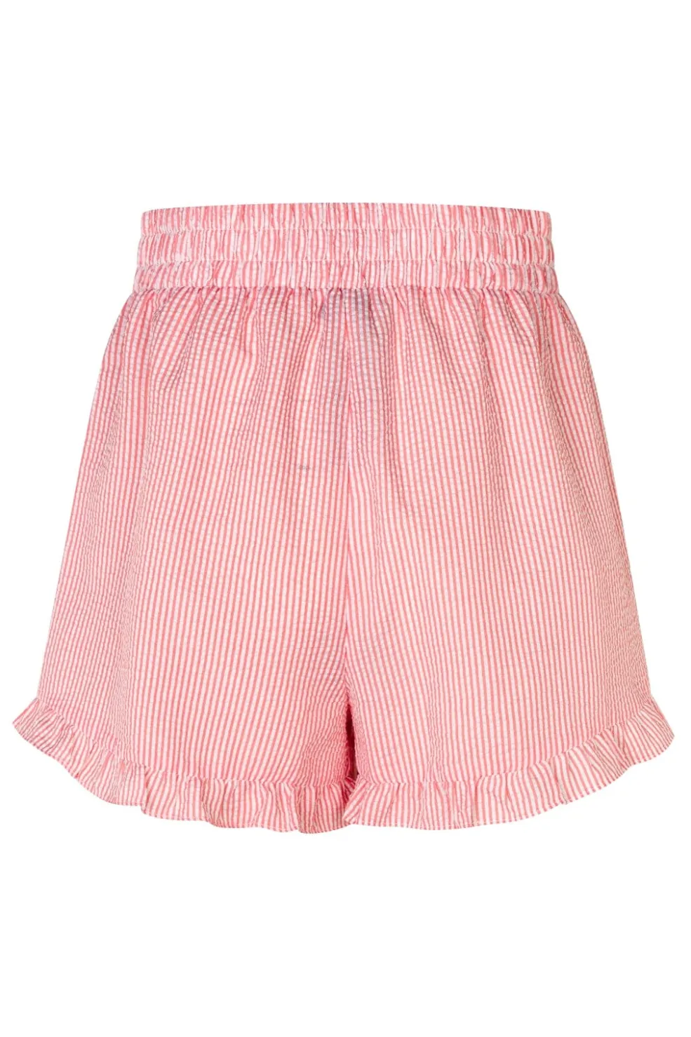 Koralrøde og hvidstribede shorts fra A-View i let polyester. De har en løs pasform med flæsekant ved bunden og elastik i taljen, hvilket gør dem behagelige at have på.