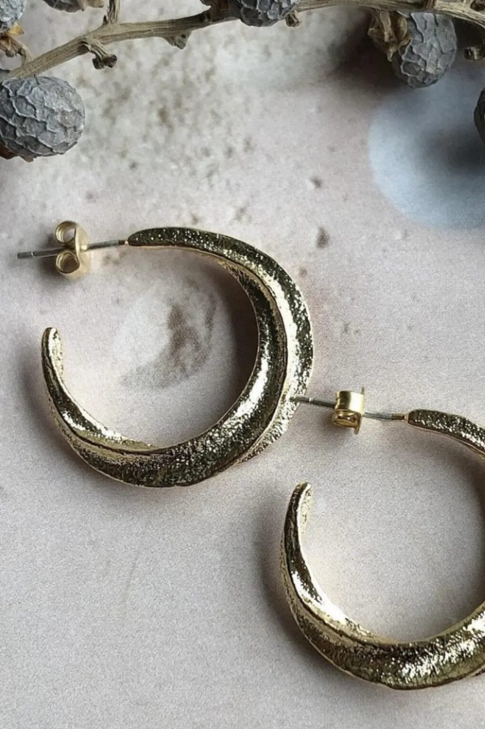 Halvmåneformede øreringe i forgyldt messing med en glitrende overflade. Øreringene har en markant bueform og en struktureret finish.