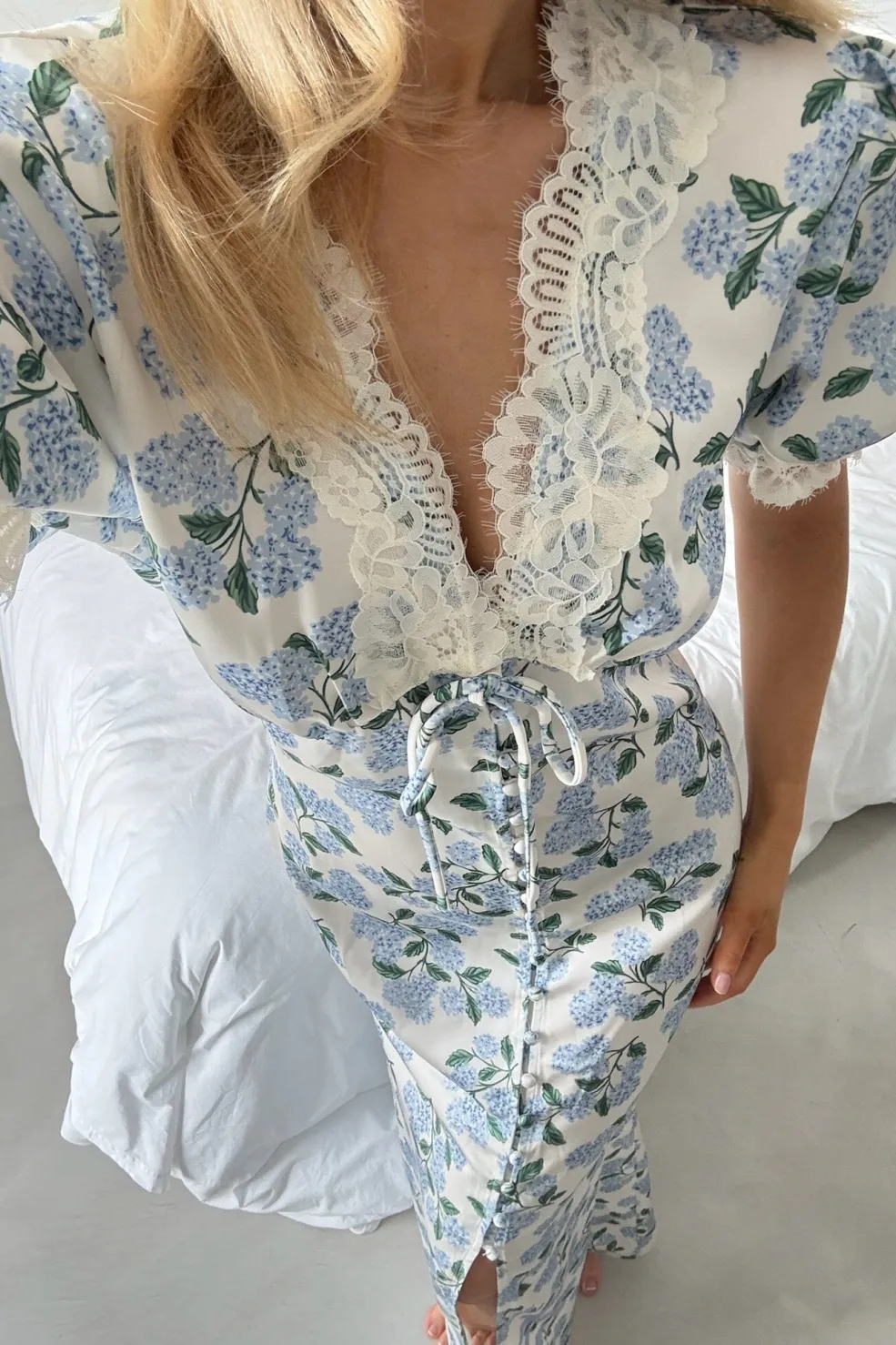 Lang kjole fra BYIC med blåt hortensia-mønster på hvid bund. Kjolen har pufærmer og V-hals med blondedetaljer samt en slids foran.