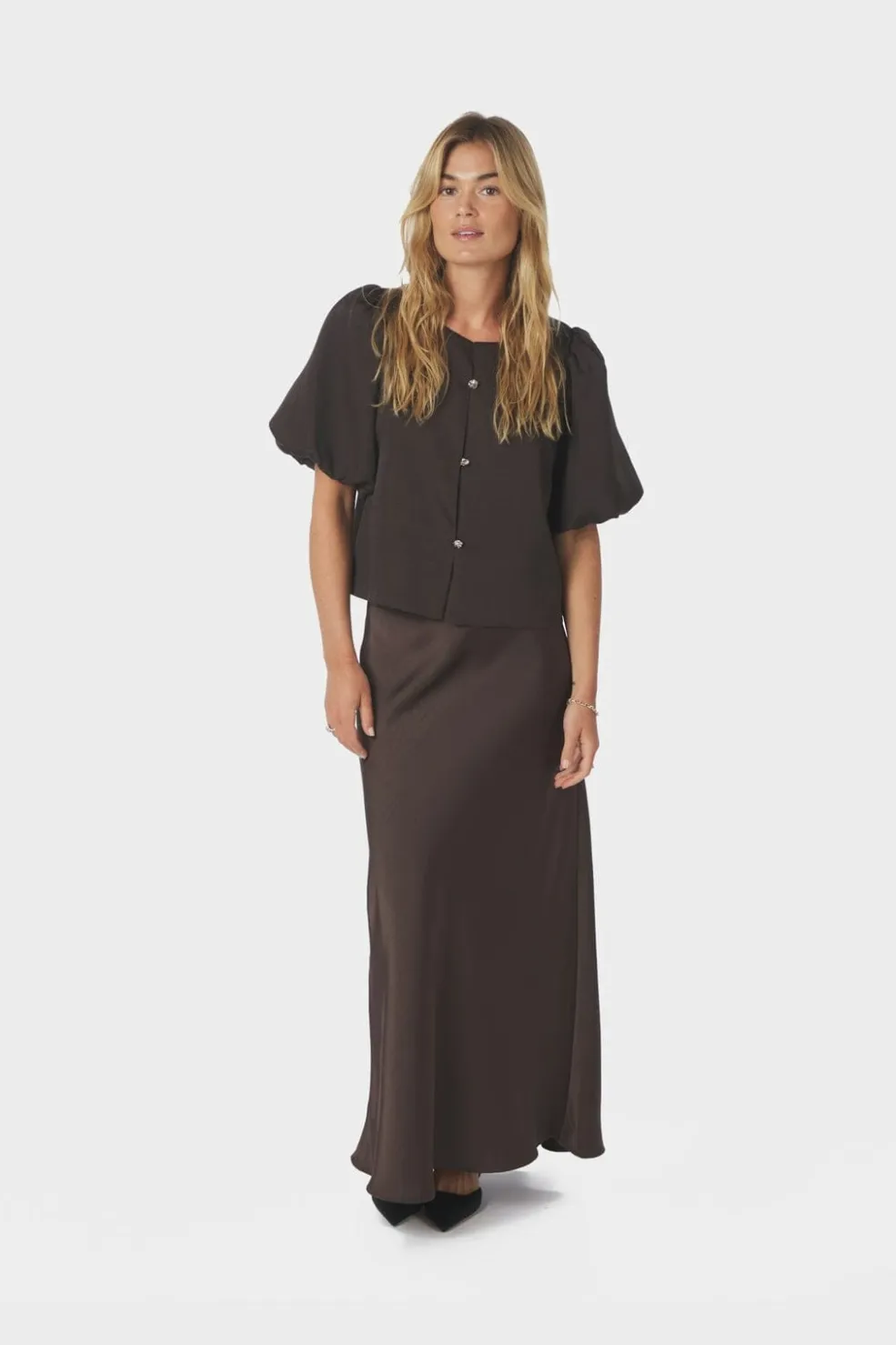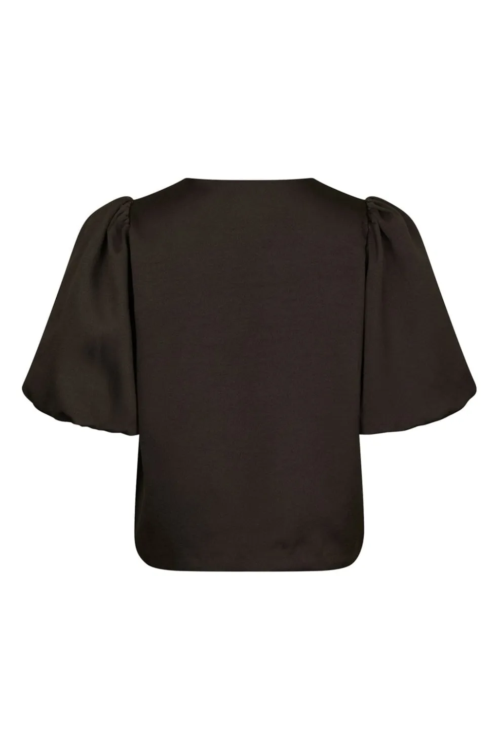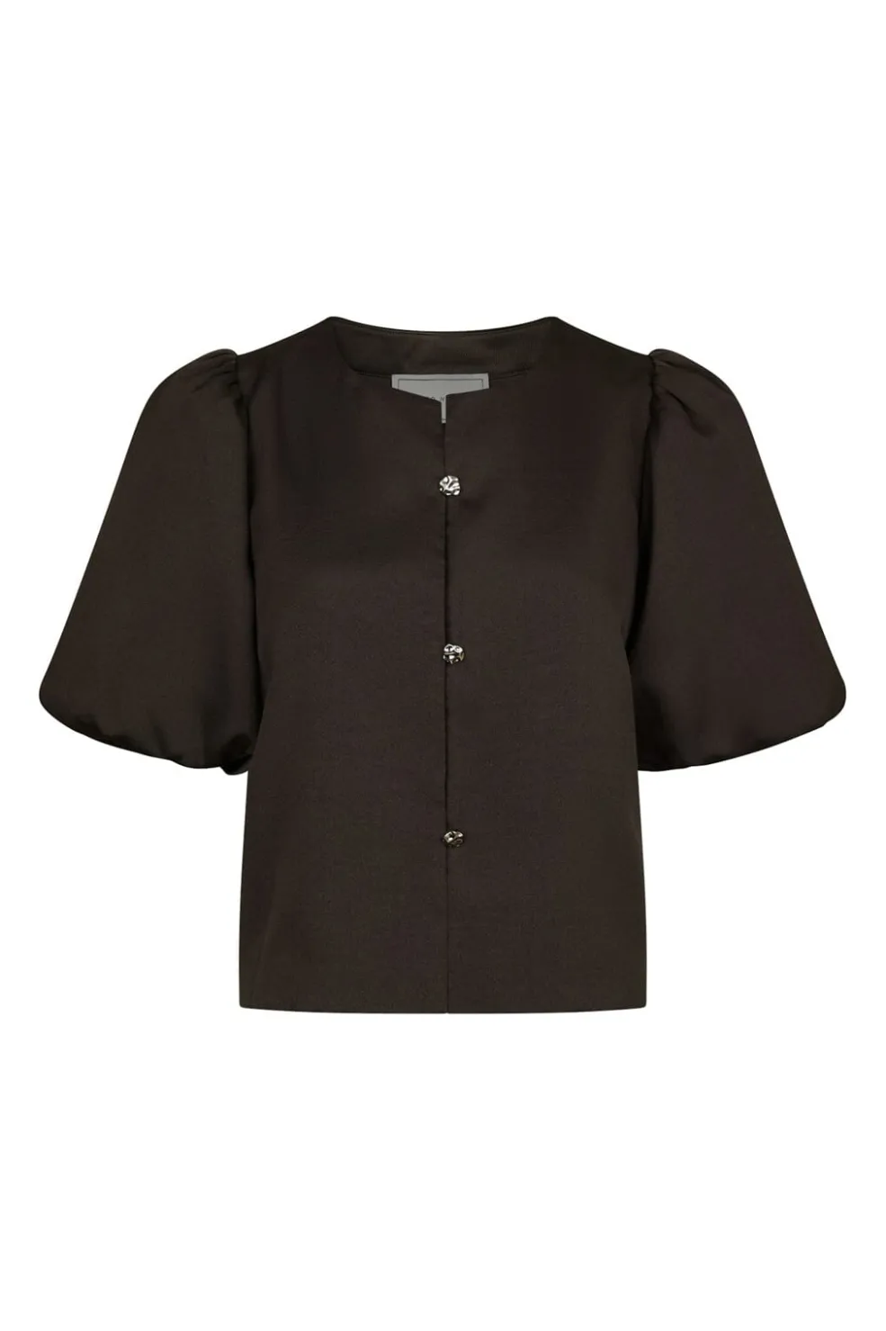 Brun satinbluse fra Neo Noir med korte pufærmer og knaplukning foran. Blusen har en rund halsudskæring og er lavet i mat satin, der giver et enkelt udtryk.