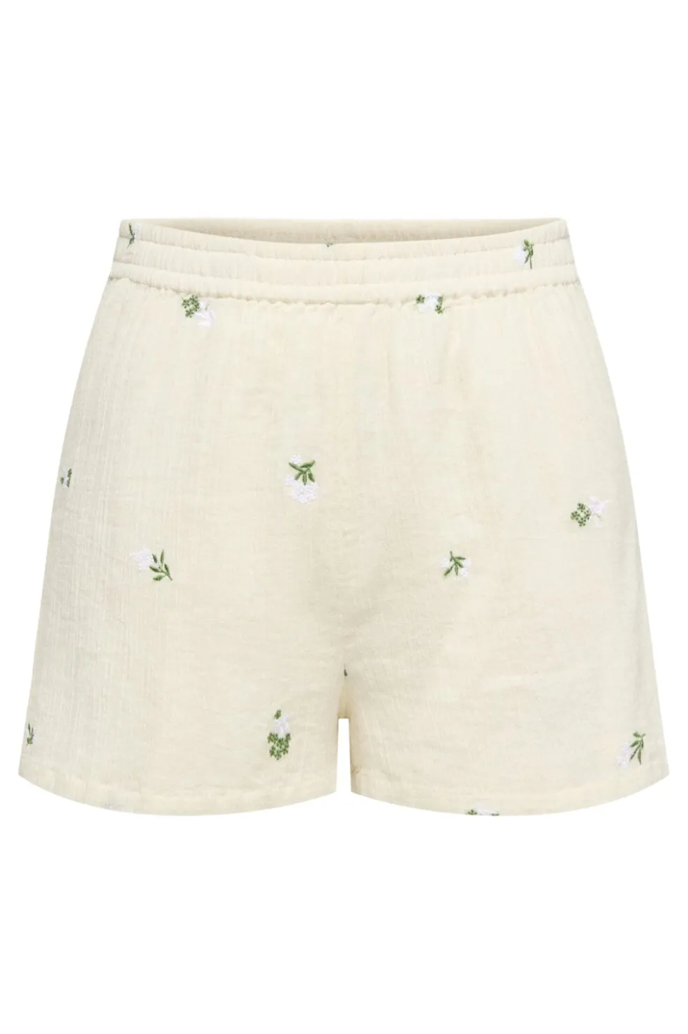Cremefarvede shorts fra JDY med broderede blomster. De har en høj talje med elastisk linning og en kort længde til midt på låret.