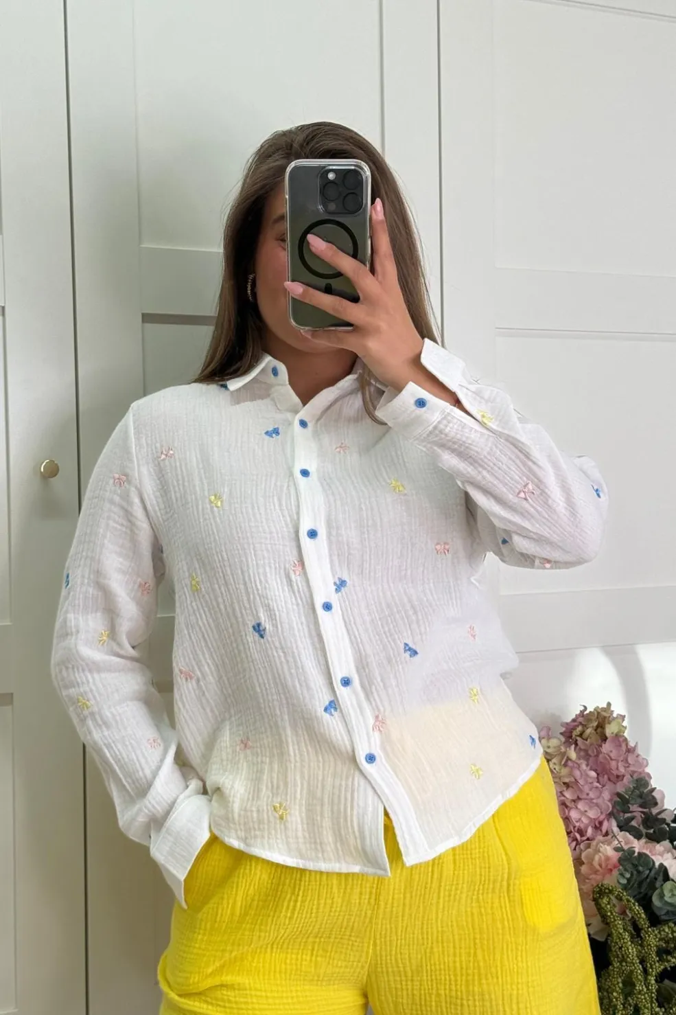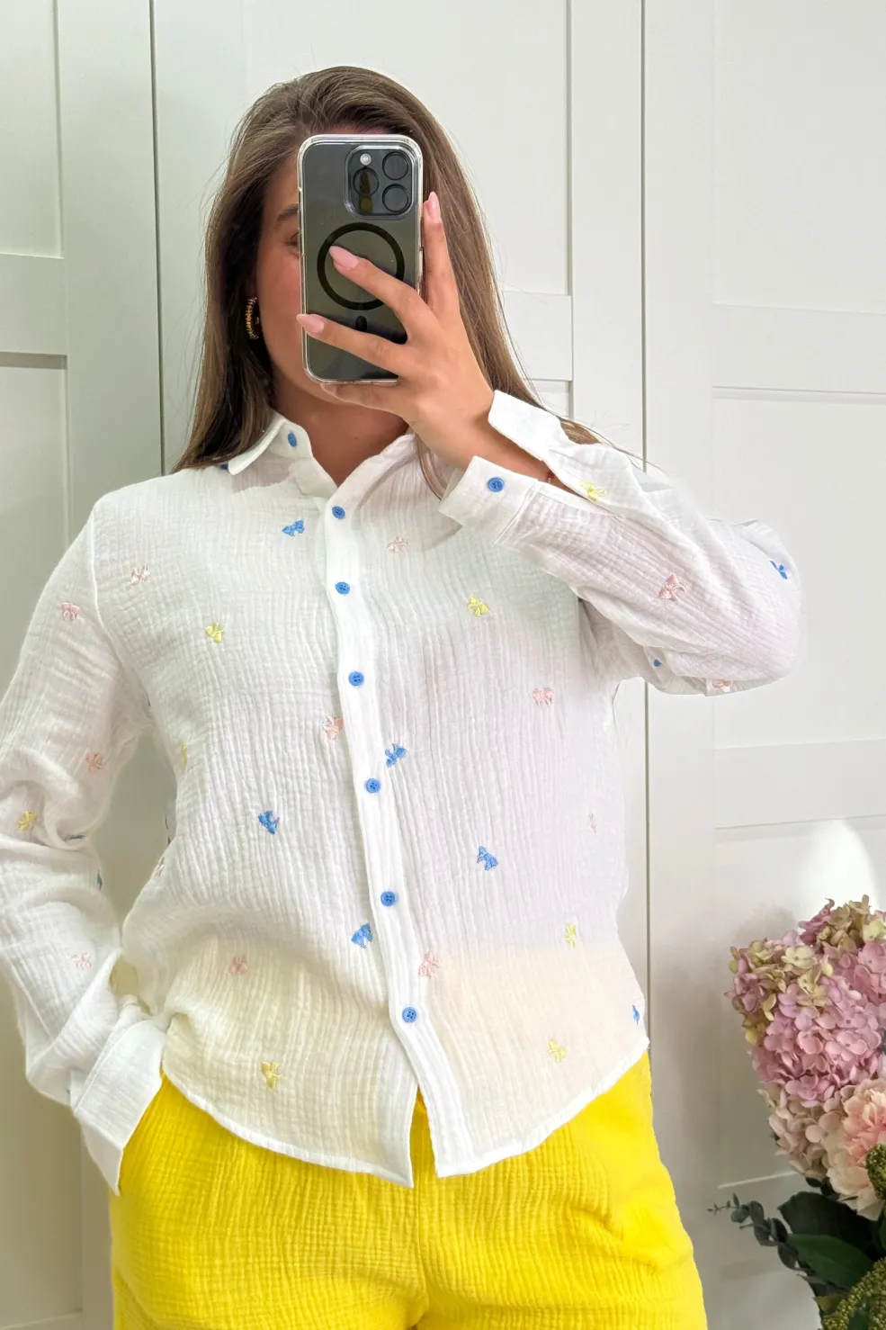 Hvid skjorte fra A-bee med broderede motiver i blå, lyserød og gul. Skjorten har blå knapper og en løs pasform med skjortekrave.